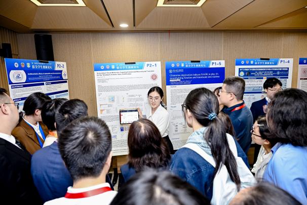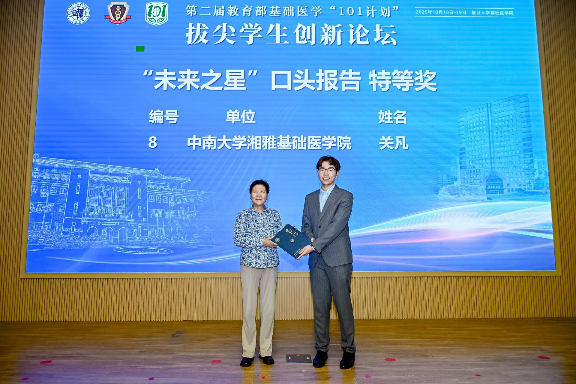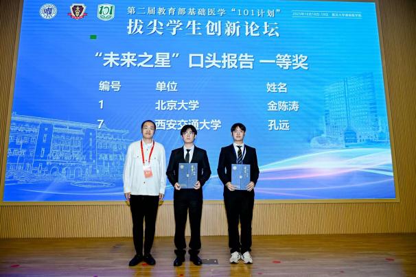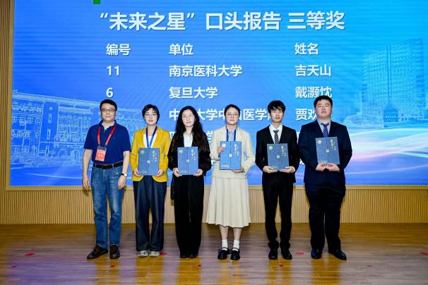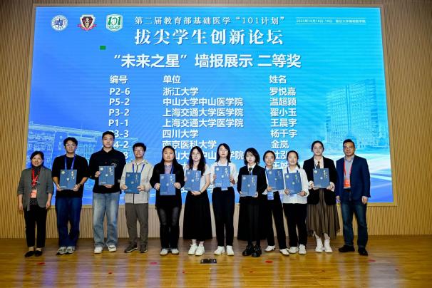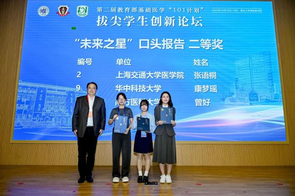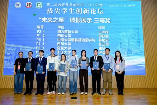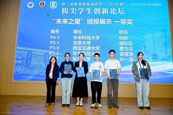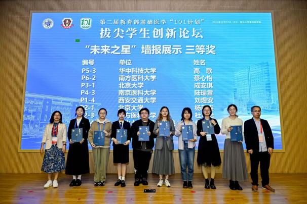 19日上午,学生创新论坛口头报告环节中,11位参会单位推荐的基础医学拔尖学生自信展示科研创意与阶段性成果。从侵入式脑机接口到精准基因编辑,从放射性头痛到软骨再生,同学们分享不同领域课题,运用不同方法,但他们有着共同的目标——希望在自己的研究方向小小地前进一步,未来能够真正地帮助到临床患者。由11位老师与11位学生组成的评委小组对口头报告进行评分。口头报告由基础医学院院长助理徐薇主持。大会延续了首届论坛的奖项设置,颁发“未来之星”口头报告特等奖1项、一等奖2项、二等奖3项、三等奖5项,“未来之星”墙报展示一等奖5项、二等奖10项、三等奖16项。汪玲与评委老师分别为获奖同学颁奖。