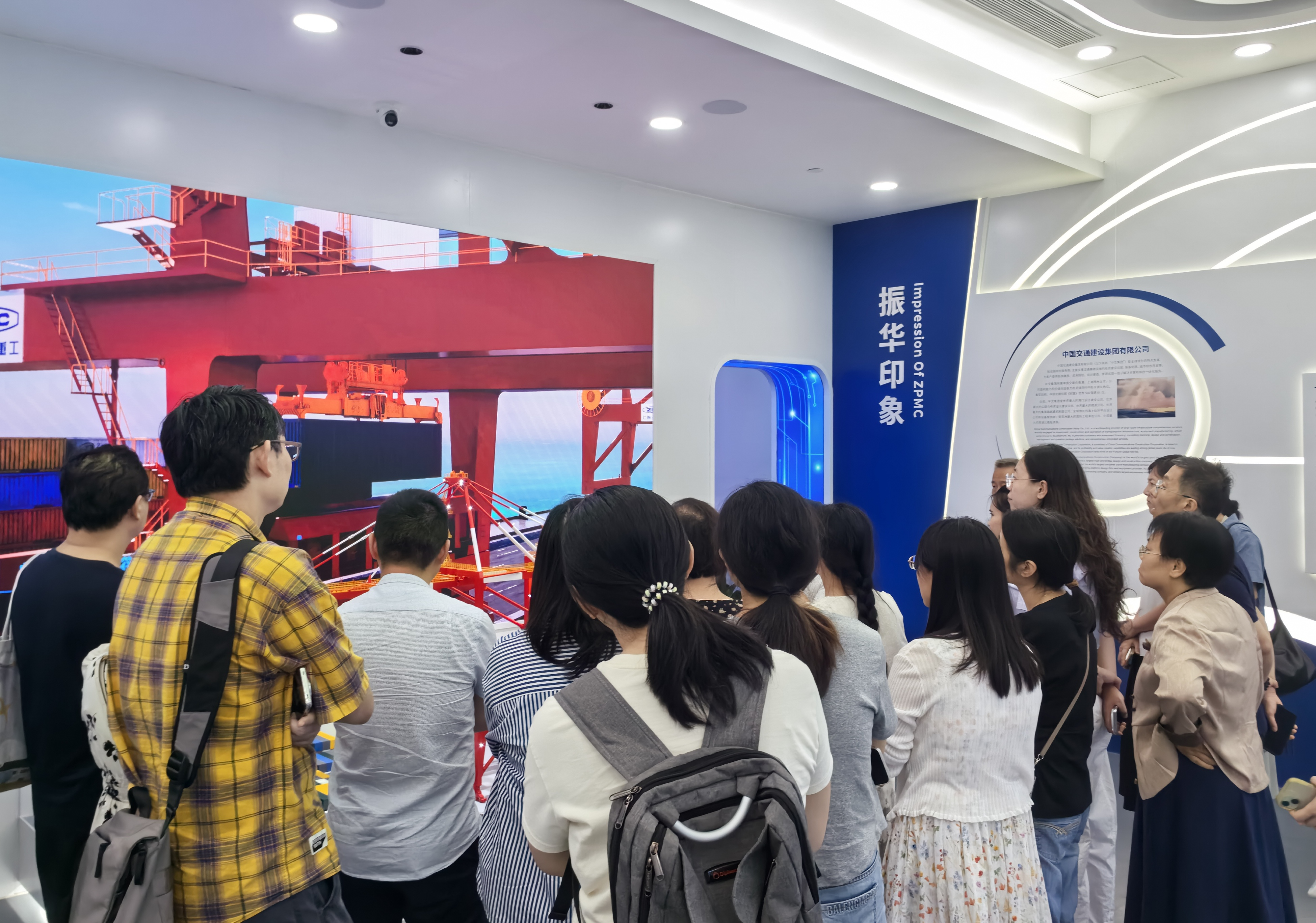 在数字化展示中心,教师们通过VR和虚拟交互系统,沉浸式体验了振华重工的全球港机装备、远洋船舶、工业园区及核心产品的三维展示。通过数字孪生、虚拟仿真和可视化技术,振华重工将庞大的工业体系以高度智能化的形式呈现,生动展现了“中国制造向中国智造”的宏伟跃迁。