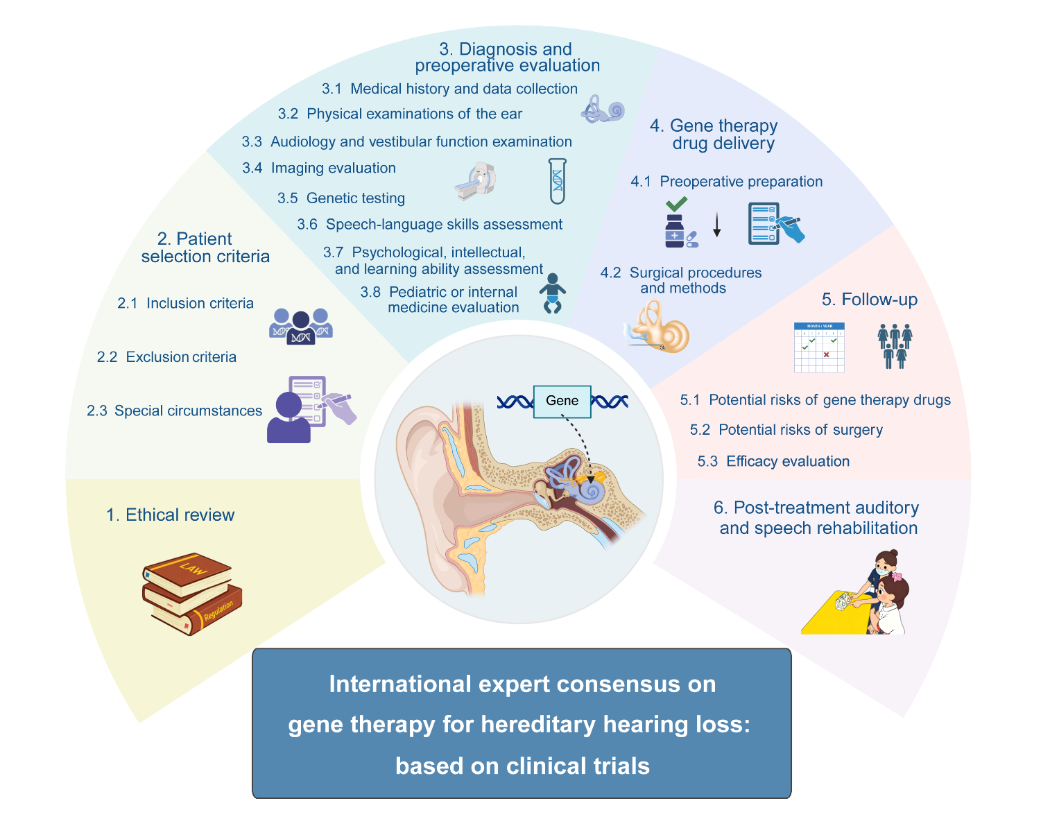 该共识严格采用改良版德尔菲法,在由美国工程院院士加州大学欧文分校Fan-Gang Zeng、美国斯坦福大学医学院Lukas D. Landegger教授、德国哥廷根大学医学中心Tobias Moser教授、《中华耳鼻咽喉头颈外科》杂志金昕编辑及华中科技大学同济医学院附属协和医院孙宇教授组成的专家指导委员会指导和监督下,于2024年3月至2025年3月,通过两轮问卷调查和一次共识会议(共三轮专家投票),最终形成30条共识声明,内容涵盖伦理审查(1条声明)、患者筛选(12条声明)、术前诊断和评估(9条声明)、基因治疗药物递送(4条声明)、术后随访(3条声明)及听觉言语康复(1条声明)六大关键模块,为全球范围内遗传性耳聋基因治疗的临床应用提供了首个标准化框架。