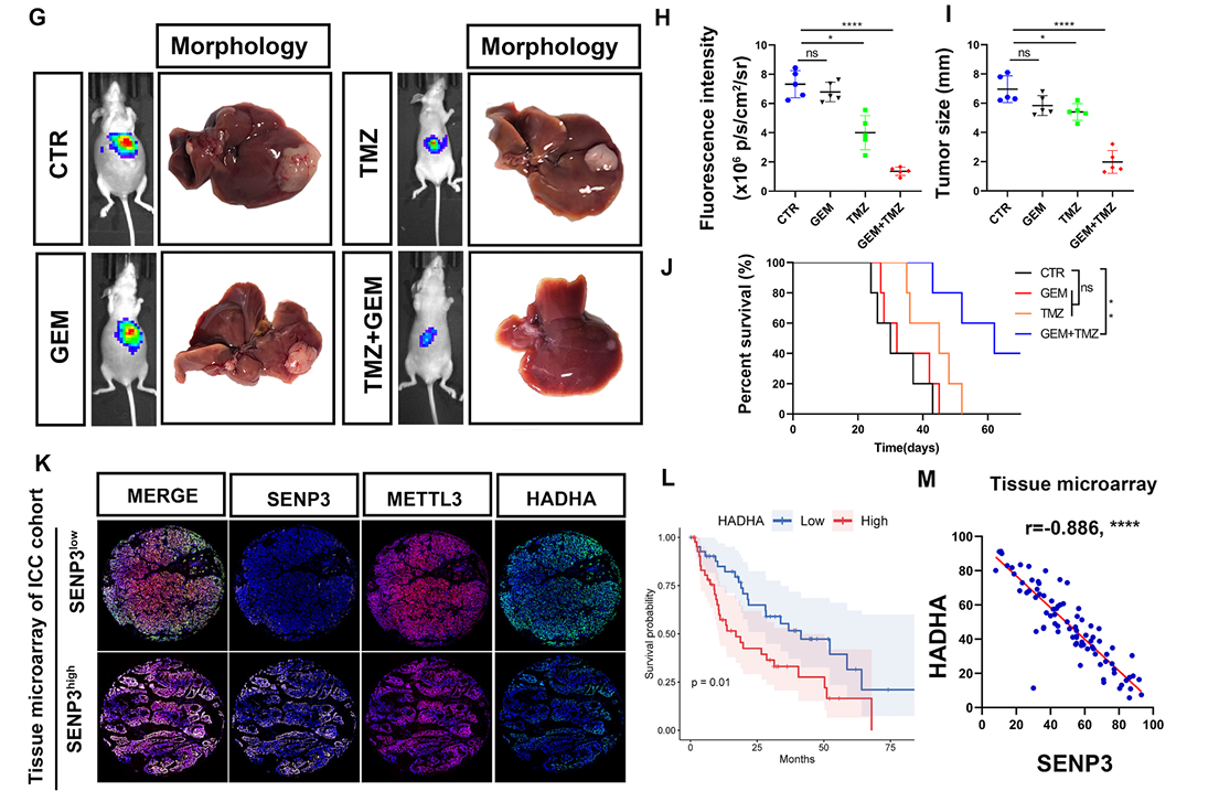 团队进一步研究后发现,甲基转移酶METTL3通过m6A修饰降解SENP3 mRNA,激活HADHA蛋白介导的脂肪酸氧化。“通过研究首次揭示胆管癌化疗耐药的关键机制——SENP3-HADHA代谢轴调控脂肪酸氧化(FAO)”王鲁教授说,在找到耐药机制和“元凶”后,我们提出了可以通过代谢联合化疗的新思路设计方案,逆转耐药性的发生比例。