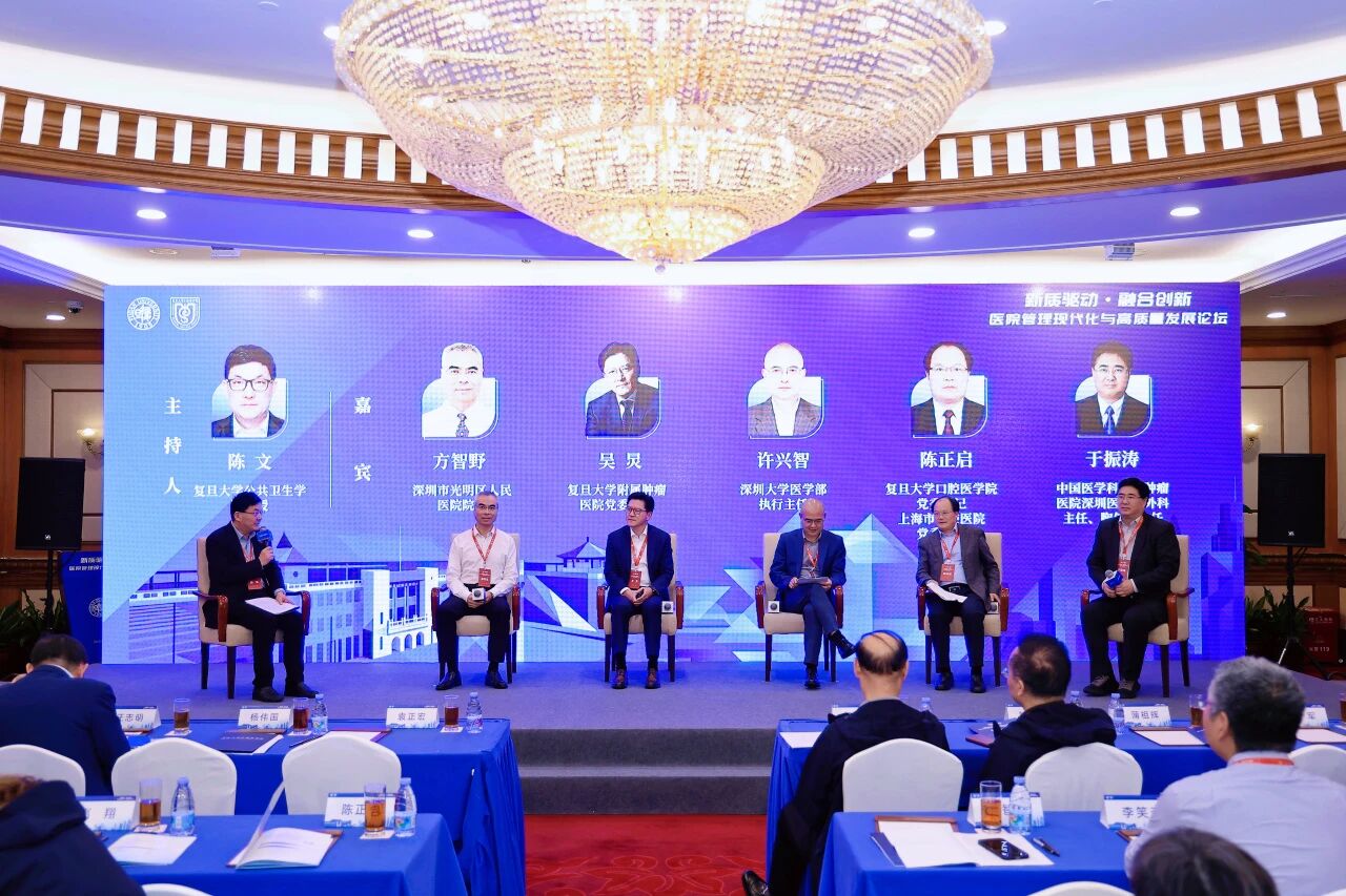 圆桌论坛上,深圳大学医学部执行主任许兴智,复旦大学附属肿瘤医院党委书记吴炅,复旦大学口腔医学院党委书记、上海市口腔医院党委书记陈正启,深圳市光明区人民医院院长方智野,中国医学科学院肿瘤医院深圳医院大外科主任、胸外科主任于振涛围绕“医院高质量发展的区域实践与系统思维”核心命题分享独到见解