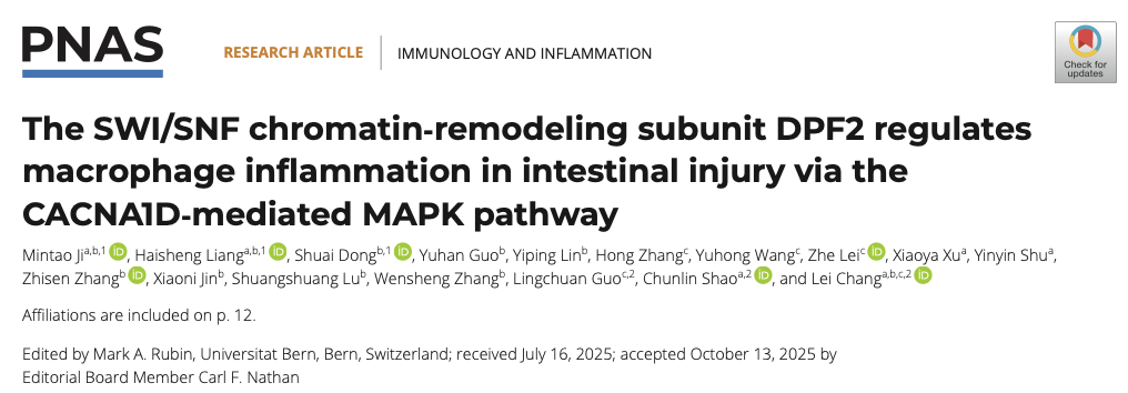 近日,复旦大学放射医学研究所畅磊研究员、邵春林研究员和苏州大学附属第一医院郭凌川教授团队合作在《美国科学院院报》(Proceedings of the National Academy of Sciences of the United States of America,简称PNAS)上发表题为“The SWI/SNF chromatin-remodeling subunit DPF2 regulates macrophage inflammation in intestinal injury via CACNA1D-mediated MAPK pathway”的研究论文,揭示了DPF2在巨噬细胞中作为肠道损伤免疫反应中关键调节剂的重要作用,其中DPF2的缺失通过减少细胞凋亡、抑制炎症和增强上皮细胞增殖来促进肠道修复,为解决各种形式的肠道损伤和慢性炎症开辟了治疗途径,可能为改善相关炎症性疾病的治疗结果提供策略。