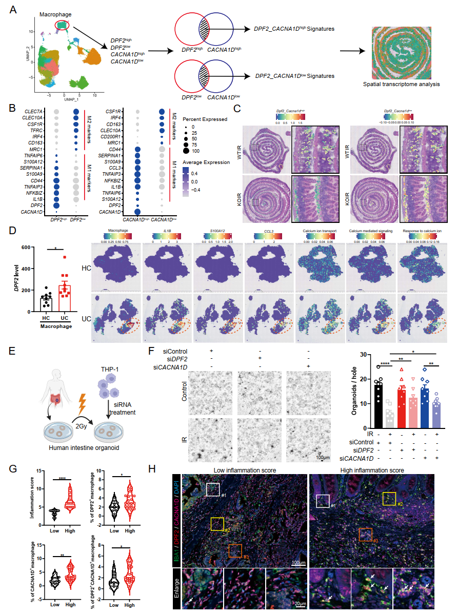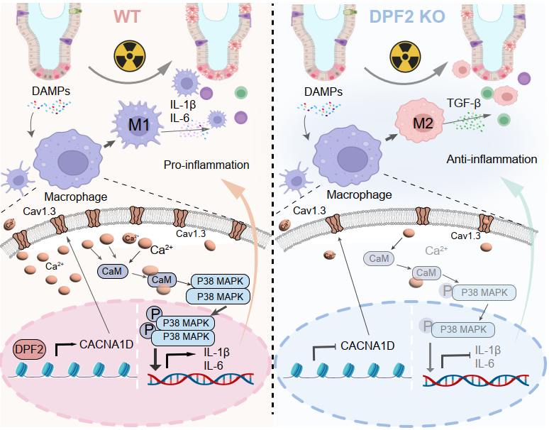 该研究发现DPF2缺失不仅增强了辐射诱导肠损伤(RIII)后肠道的再生能力,还改变了巨噬细胞的异质性与分化状态,并显著降低了巨噬细胞内的钙离子水平。重要的是,在RIII小鼠模型和临床RIII患者来源的类器官模型中靶向DPF2和CACNA1D可促进修复和增殖。