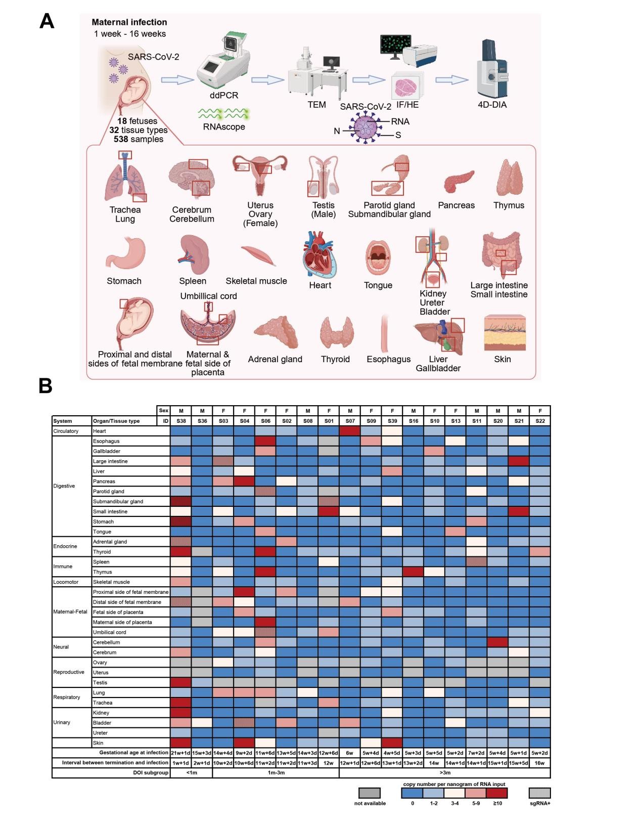 该研究对18例母体孕期感染过SARS-CoV-2后因各种原因在孕中期终止妊娠的胎儿进行了系统性的尸检分析。研究人员收集了32种不同脏器类型共计538份样本,运用ddPCRRNAscope、透射电镜等先进的分子生物学技术,以前所未有的广度与精度,探寻并量化了病毒在胎儿全身的分布和复制情况。