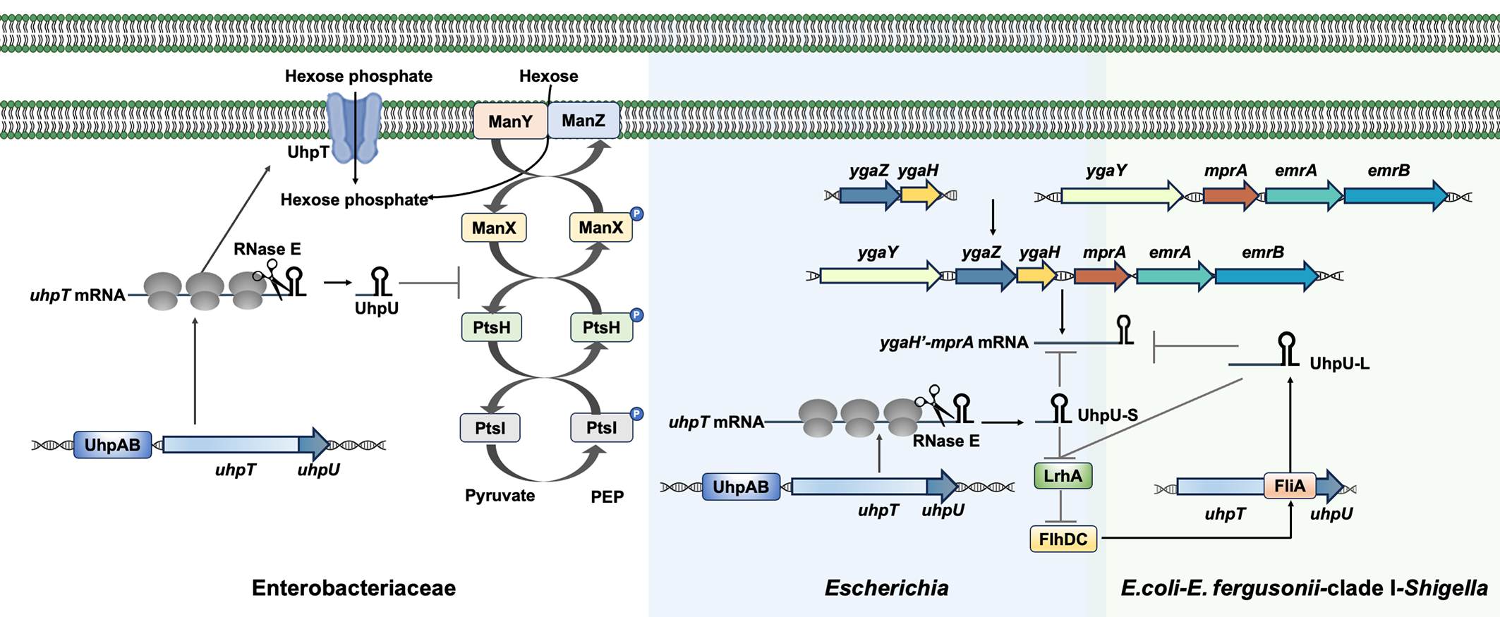 研究在肠杆菌科中发现了一个保守存在、来源于6-磷酸葡萄糖转运蛋白基因uhpT 3′UTR的sRNA——UhpU。通过比较沙门菌和大肠埃希菌中UhpU的产生方式与调控网络,研究团队发现其在肠杆菌科中具有一致的衍生机制和功能模式:该sRNA通过核糖核酸酶RNase E对uhpT mRNA的加工产生,并抑制葡萄糖特异性磷酸转运系统,从而与UhpT蛋白共同参与6-磷酸葡萄糖代谢。该发现提示UhpU的起源与肠杆菌科对该碳源的利用密切相关。