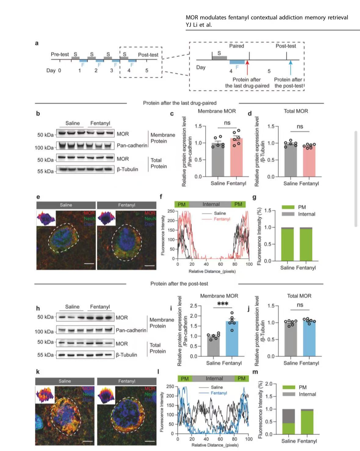 进一步的细胞实验也验证了芬太尼成瘾记忆的提取过程与神经元细胞膜MOR上膜密切相关,而非仅改变其总蛋白水平。