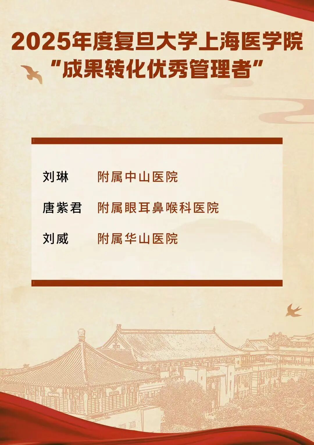会上,2025年度“科研管理先进个人”“科研管理先进团队”及“成果转化优秀管理者”名单揭晓,公共卫生学院教师罗君、中山医院肝肿瘤外科主任医师施国明、华山医院科研处副处长刘威作为获奖代表发言。