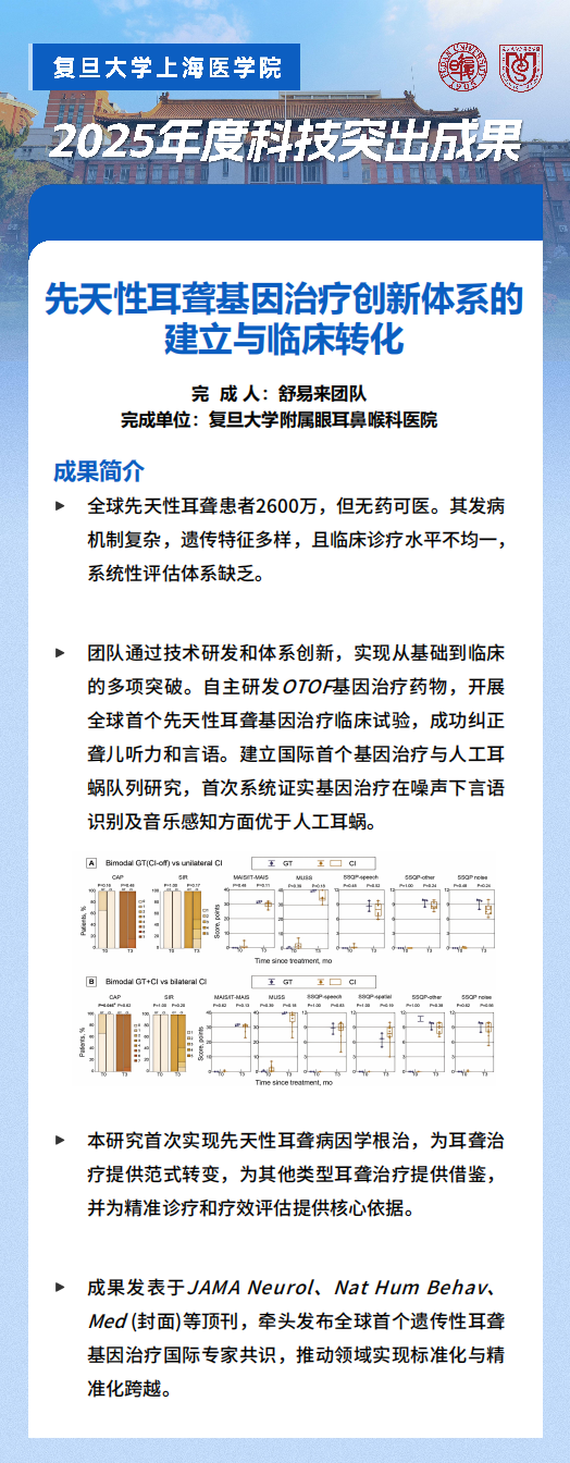 临床研究与成果转化领域,6项成果分别在肿瘤分子边界快速定位、先天性耳聋基因治疗等方面取得创新性成果,在临床应用中成效显著。