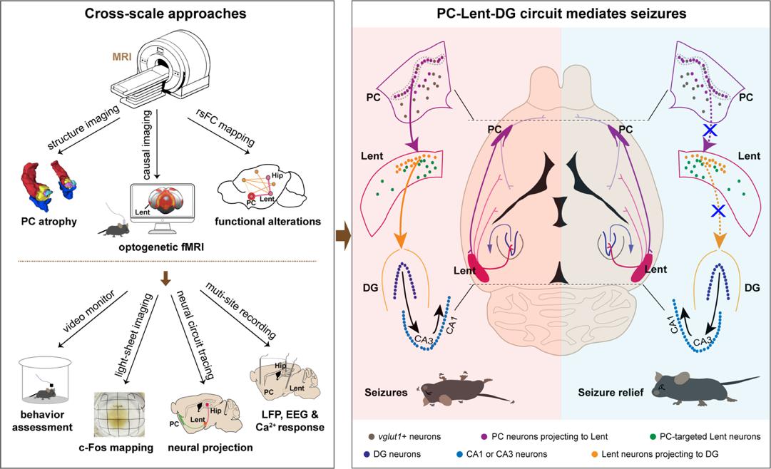 这项研究通过基于超高场强fMRI有效构建了多模态研究框架,首次从复杂脑网络中解析出一条全新的致痫通路——PC→Lent→DG环路,它不仅负责启动癫痫发作,还驱动着发作向全脑传播,最终引发全脑广泛的功能重组。该研究揭示了一个与传统癫痫 Papez 环路不同的全新“输入”通路,为癫痫干预提供了新的潜在靶点。