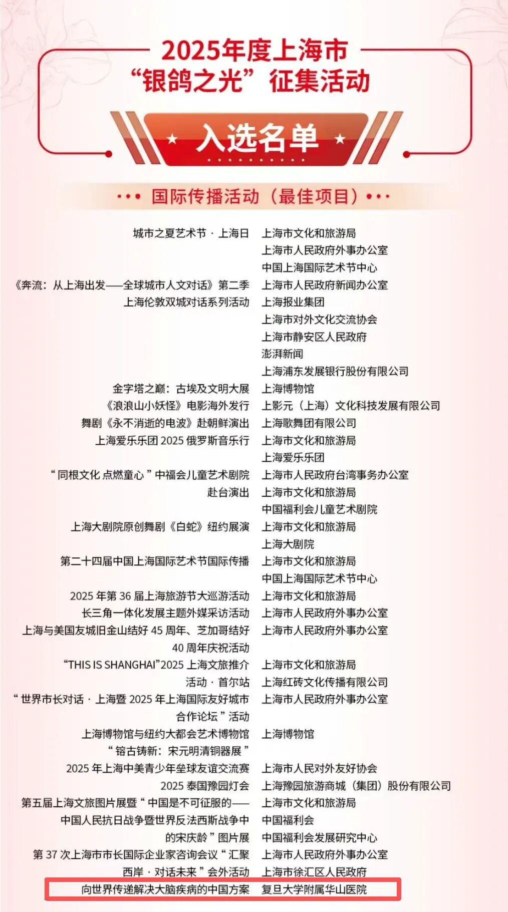 2月26日,2025年度上海市“中华文化国际传播”、“银鸽之光”第二十届上海市国际传播优秀项目征集活动结果揭晓。复旦大学附属华山医院“向世界传递解决大脑疾病的中国方案”入选“银鸽之光”国际传播活动(最佳项目)。