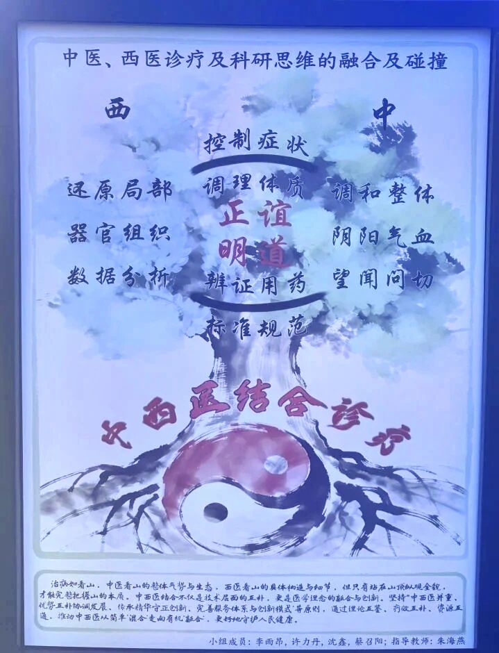 中西医融合展台则别具韵味。水墨风海报以太极、树枝为意象,象征中西医根系相连、互补共生。“一开始我对中医有偏见,真正进门诊、看病例才明白:中西相映才更完整。”2024级临床医学(八年制)本科生李雨昂指着课题《中医、西医诊疗及科研思维的融合及碰撞》的海报说,“药学院微生物与生化药学系的朱海燕老师带我们深入中西医门诊、走进中药博物馆,在真实诊疗场景中感受不同学科思维的碰撞与交融,正是这种跨学科、跨专业的指导与协作,让大家在跨界视野中拓宽科研思路。”展板前,不少同学驻足观看,驻足思考。
