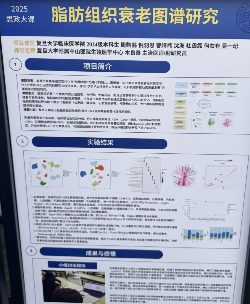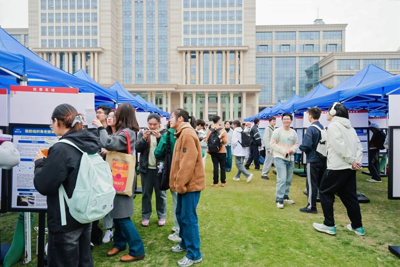 生命机理探索同样精彩。2024级临床医学(五年制)本科生周凯鹏团队带来《脂肪组织衰老图谱研究》,在导师指导下整合测序数据,“脂肪衰老和糖尿病、内分泌病密切相关,我们希望画出一张清晰‘地图’,给后续研究打基础。”周凯鹏说。