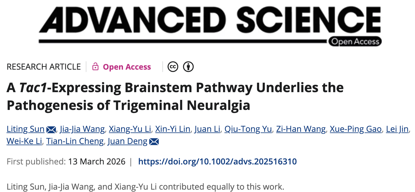 微风拂面、刷牙洗脸,对普通人是日常,但对三叉神经痛(Trigeminal Neuralgia, TN)患者却是如电击、火灼般的噩梦。长期以来,我们虽知其痛,却难寻其源。近日,复旦大学脑科学转化研究院邓娟/孙立婷团队在《先进科学》(Advanced Science)发表题为“A Tac1-Expressing Brainstem Pathway Underlies the Pathogenesis of Trigeminal Neuralgia”的研究,通过对脑干环路的全面解析,精准锁定了驱动这一剧痛的关键分子—Tac1。