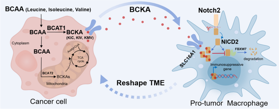 肿瘤细胞高度依赖支链氨基酸(BCAA),通过增强其摄取与代谢来驱动肿瘤发生发展。既往研究多聚焦于BCAA在肿瘤中参与蛋白质合成或激活mTORC1信号通路,但对其下游代谢产物在肿瘤微环境中的作用关注甚少。支链酮酸(BCKA)作为BCAA的主要分解代谢产物,在肿瘤内丰度较高,但其功能及感知机制仍不明确。