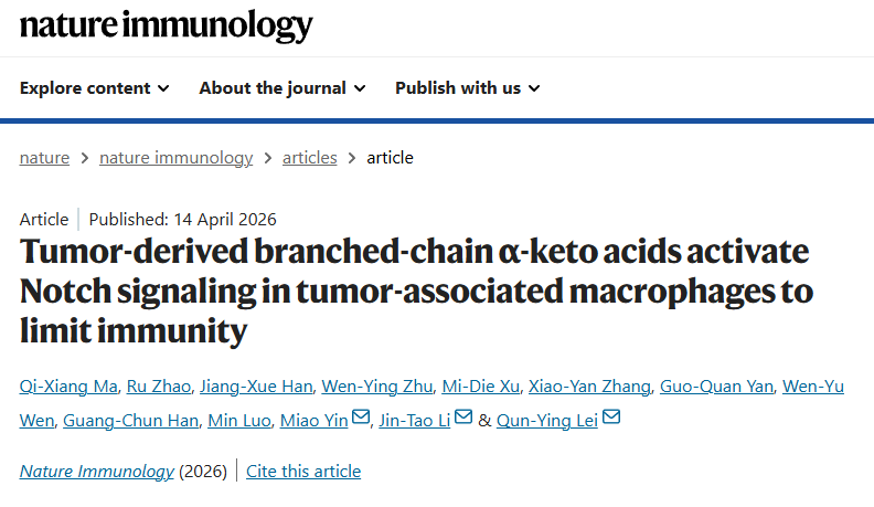 4月14日,复旦大学基础医学院前沿创新中心雷群英团队在《自然-免疫学》(Nature Immunology)上发表了题为“Tumor-derived branched-chain α-keto acids activate Notch signaling in tumor-associated macrophages to limit immunity”的研究论文,揭示肿瘤细胞分泌的BCKA作为一种信号代谢物,被肿瘤相关巨噬细胞(TAMs)中的NOTCH2蛋白直接感知,进而驱动巨噬细胞向免疫抑制表型转化,促进肿瘤恶性进展。这一发现为靶向肿瘤代谢与免疫微环境的联合治疗策略提供了全新的理论依据和潜在干预靶点。