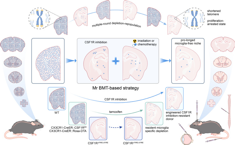 Figure 3 Strategies and principles for establishing a prolonged microglia-free niche to achieve meaningful and efficient microglia replacement. (Image from Rao et al., Cell Stem Cell, 2025)