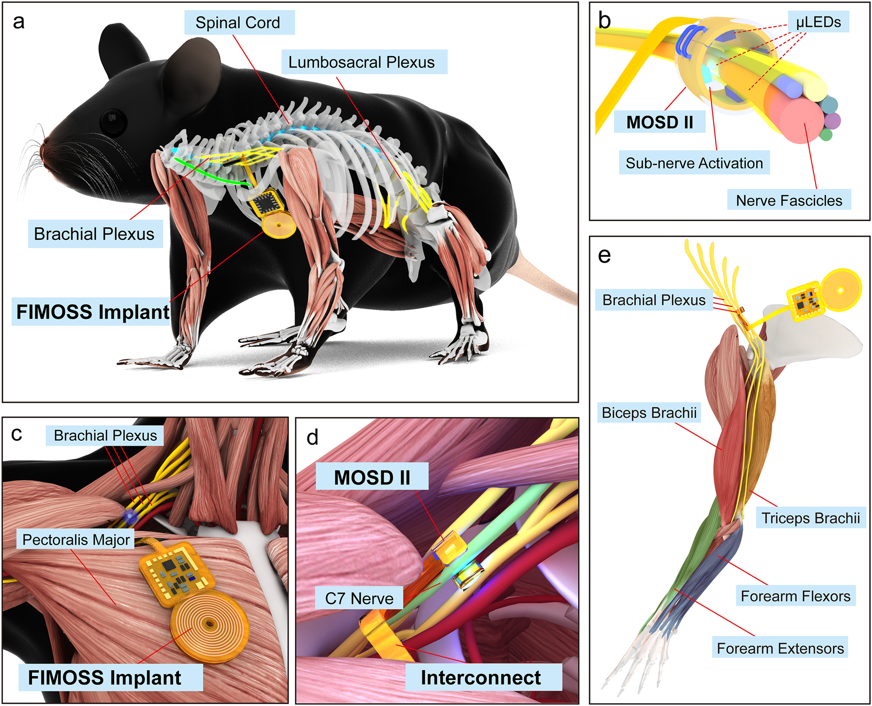 该研究开发了一个完全植入式、无线、无电池、可重复编程的多点光遗传刺激系统(FIMOSS)。该设备重量仅约0.127克,主体部分可以舒适地植入小鼠胸部皮下,其核心的柔性光纤环则能包裹在周围神经上(直径可小至250微米)。通过外部无线设备供能和发送指令,研究人员可以点亮环绕在神经上的4个微型LED灯中的任意一个,从而以亚神经束的分辨率精准激活特定的神经纤维。该系统成功在小鼠体内稳定工作长达12周,并通过了严格的加速老化测试和生物相容性评估。植入设备的小鼠运动功能未受影响,神经组织也未出现明显的炎症或损伤,证明了其长期应用的安全性与可靠性。