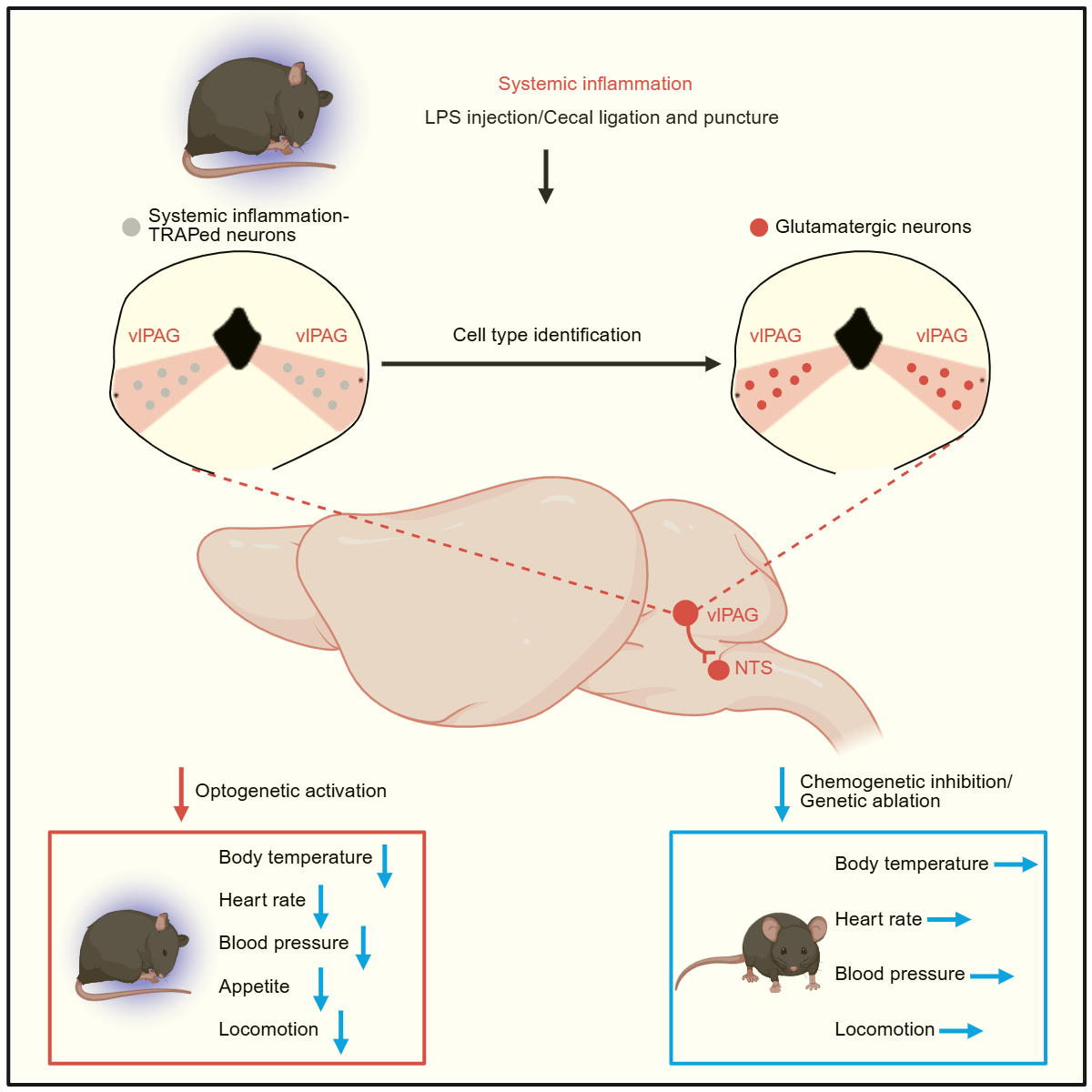 研究团队以脂多糖(LPS)和盲肠结扎穿孔术(CLP)诱导系统性炎症的小鼠模型为基础,运用TRAP标记、光遗传学激活、化学遗传学抑制、环路示踪及电生理记录等手段,证实在急性炎症期间,vlPAG的谷氨酸能神经元被显著激活,并通过向延髓NTS脑区投射,驱动低体温、心血管功能抑制以及活动减少的典型低代谢表型。进一步的功能实验表明,抑制这一通路的活动水平能有效缓解炎症导致的低代谢状态,而在非炎症状态下激活该环路则可重现低代谢症状。这一发现为深入理解炎症—代谢相互作用提供了重要的中枢神经环路证据,也为严重感染和脓毒症的临床干预策略提供了新的理论支撑和潜在靶点。未来,研究团队将进一步聚焦于神经胶质细胞与神经元之间的相互作用,深入解析其在炎症诱导低代谢状态中的具体作用及分子机制。