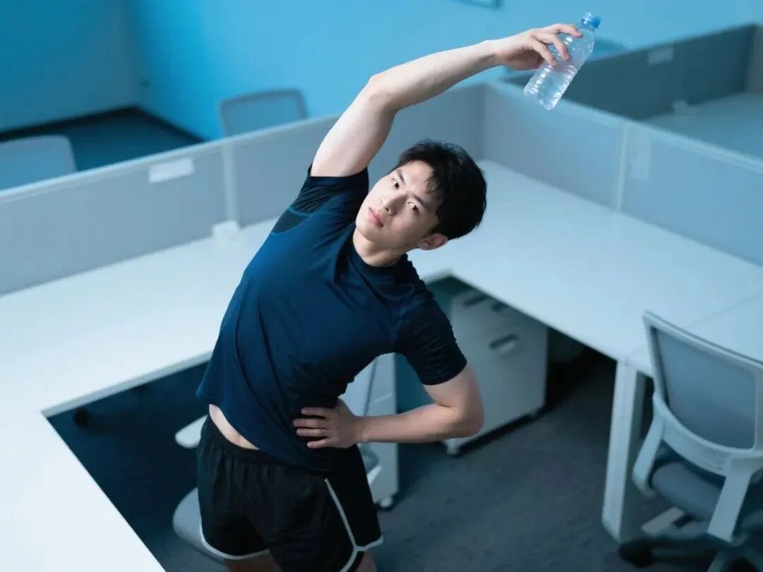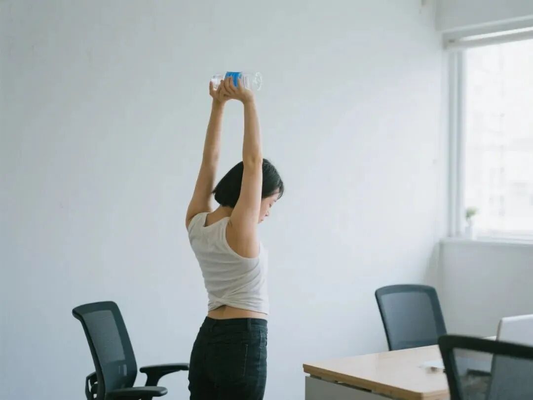 接水间隙拉伸:手臂上举拉伸侧腰,缓解久坐僵硬。