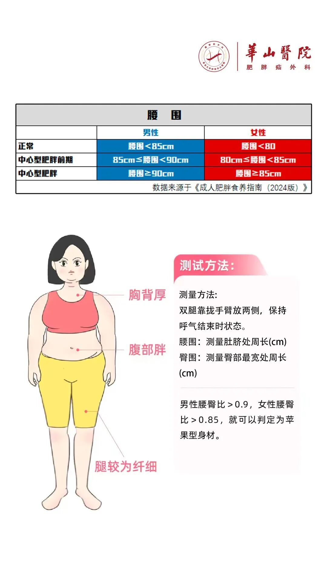 腰围:男性≥85cm、女性≥80cm提示内脏脂肪超标,与糖尿病、心血管疾病风险直接相关。