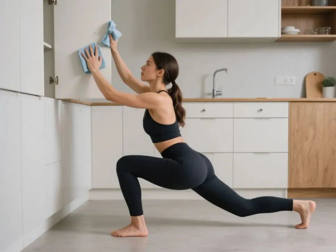 深蹲/箭步蹲擦灰法:清洁家具时,保持深蹲或箭步蹲的姿势(膝盖不过脚尖),锻炼臀腿肌群。