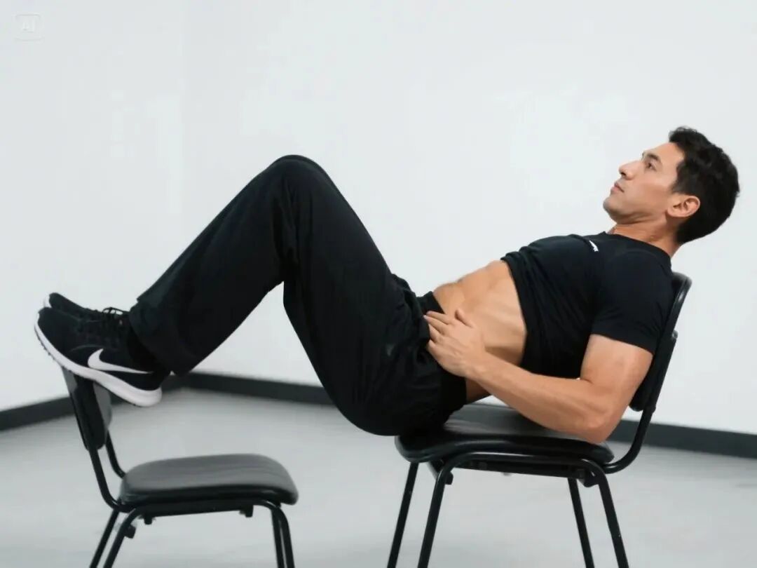椅子卷腹:坐椅前1/3,身体后仰用腹部发力,保持10秒,重复5组。