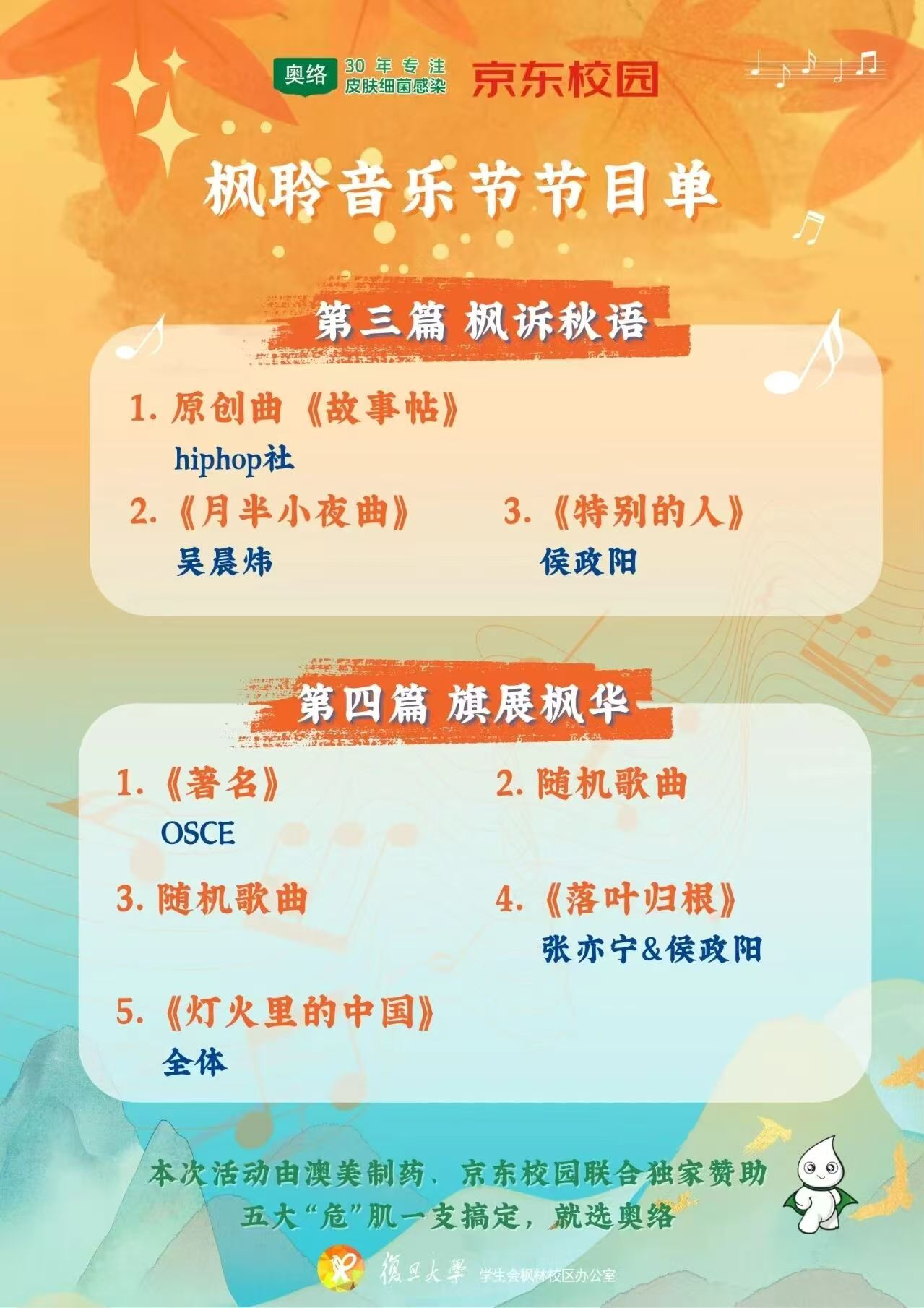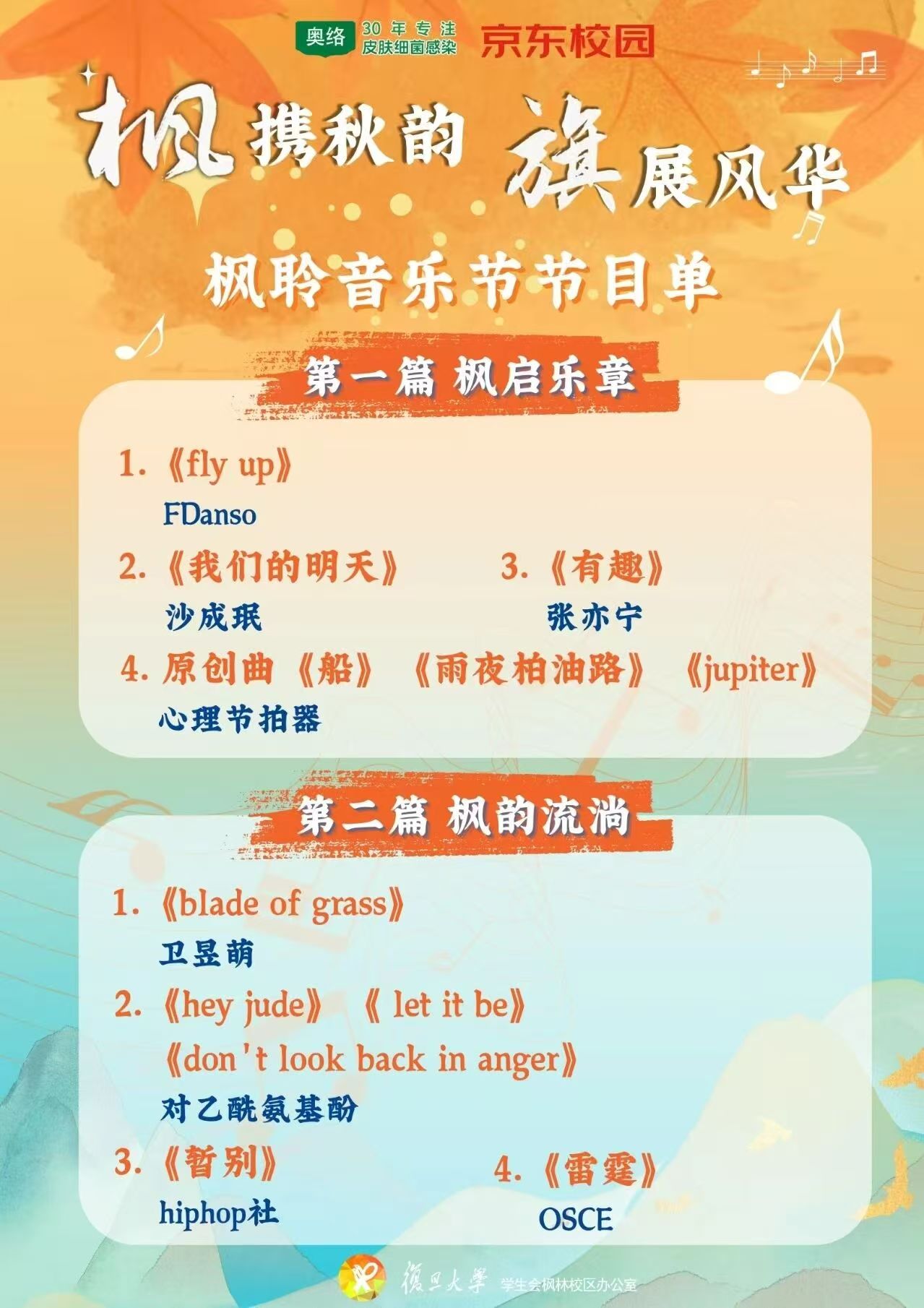 108日晚,“枫携秋韵 旗展风华”枫聆音乐节在枫林校区同生广场举行。上医师生在金秋的旋律中欢聚,共同庆祝中华人民共和国成立76周年的重要时刻。让我们透过这些闪光的片段,共同重温这个属于旋律、青春与热爱的夜晚。