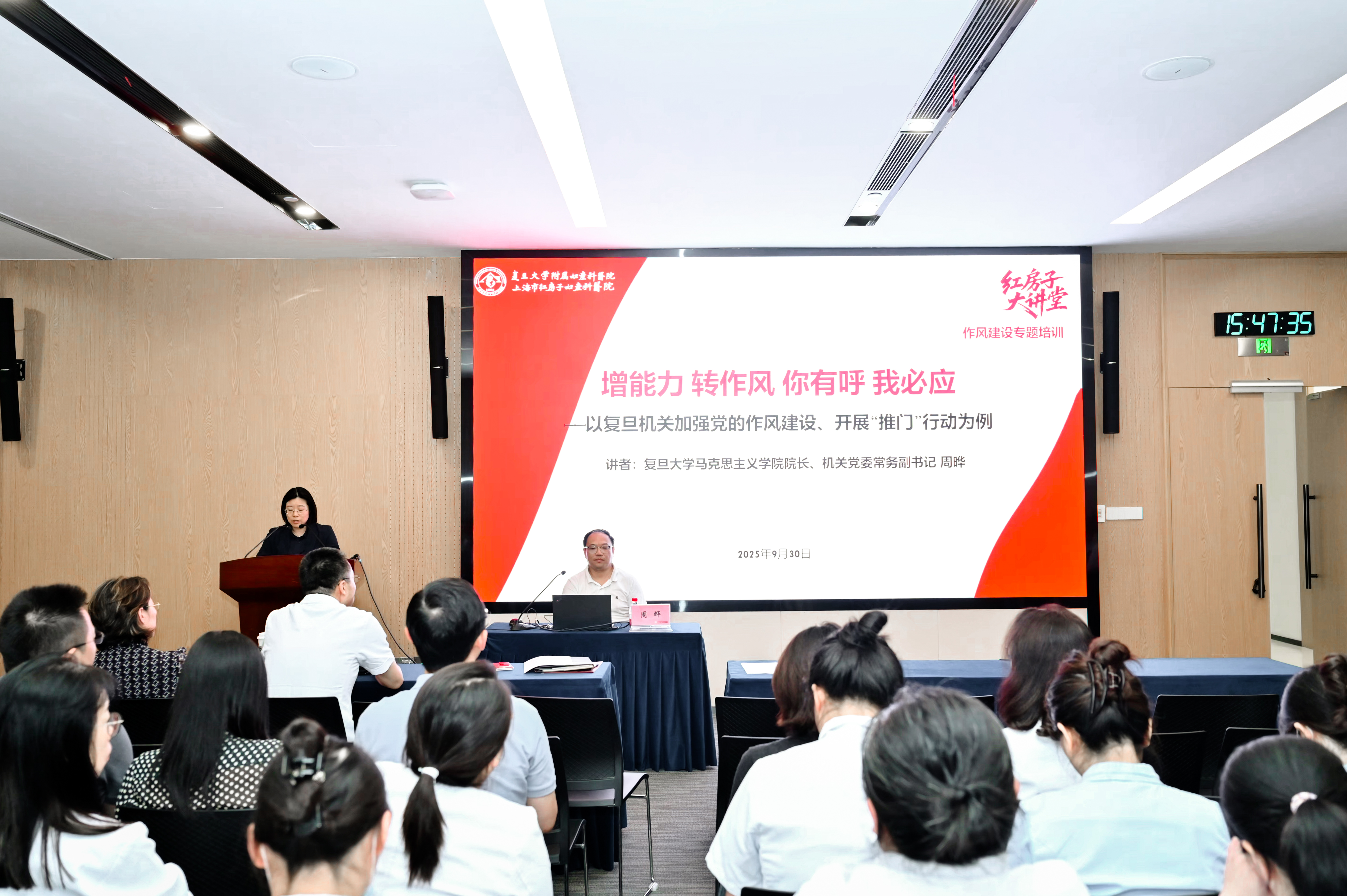 9月30日,复旦大学附属妇产科医院在杨浦院区科教综合楼一楼报告厅举办“红房子大讲堂”作风建设专题培训。培训聚焦作风建设深化与行政效能提升,特邀复旦大学马克思主义学院院长、复旦大学机关党委常务副书记周晔老师作专题授课。院领导、中层干部、党支部书记、护士长等参会学习。培训由妇产科医院党委书记徐瑾主持。