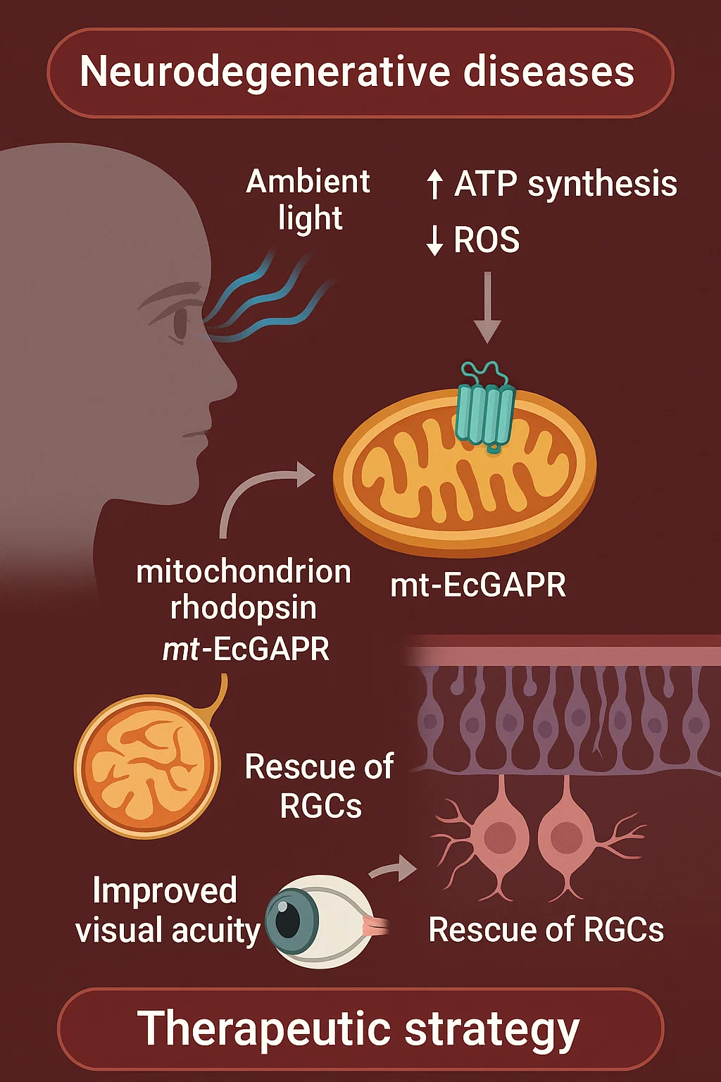 纳米线人工光感受器等视觉假体为视网膜疾病提供了功能修复的可能。然而,视觉假体并不能逆转视网膜神经元的凋亡进程。复旦大学脑科学研究院/脑功能与脑疾病全国重点实验室张嘉漪/颜彪团队与郑州大学第一附属医院康建胜教授团队合作开发了一种新型的定位于线粒体内膜的光动力蛋白mt-EcGAPR,环境光进入青光眼实验模型小鼠眼球后,激活该蛋白并促进线粒体功能,从而缓解视网膜神经节细胞的丧失和视功能的损伤。该研究成果以“Ambient light alleviates retinal neurodegeneration in mice by powering mitochondria via the engineered optoenergetic rhodopsin”(利用工程化光遗传蛋白驱动线粒体以缓解视网膜神经变性)为题,于2025年10月30日在线发表于Signal Transduction and Targeted Therapy期刊上。
