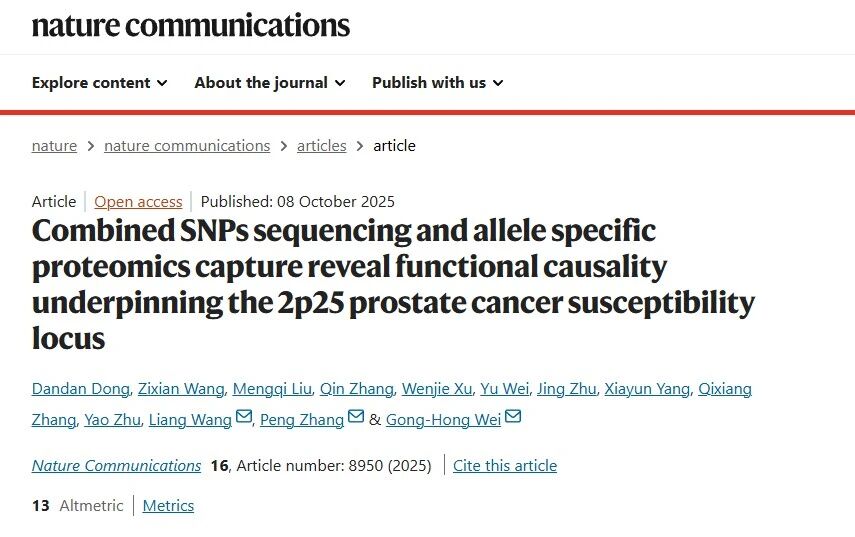 2025年10月8日,复旦大学基础医学院生物化学与分子生物学系卫功宏团队在《自然-通讯》(Nature Communications)期刊上发表了题为“Combined SNPs sequencing and allele specific proteomics capture reveal functional causality underpinning the 2p25 prostate cancer susceptibility locus”的研究论文。该研究通过整合高通量SNPs-seq技术与等位基因特异性蛋白质组学分析,系统解析了前列腺癌风险位点2p25的功能机制,首次揭示了转录因子USF1通过结合风险等位基因rs4519489-A上调致癌基因NOL10的表达,进而驱动前列腺癌进展的分子通路。