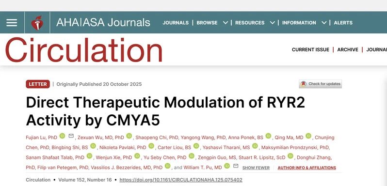 2025年10月20日,复旦大学生物医学研究院、附属中山医院上海心研所的路福建和哈佛医学院波士顿儿童医院的William Pu合作,在《循环》(Circulation)发表题为“Direct Therapeutic Modulation of RYR2 Activity by CMYA5”的文章。该研究解析了CMYA5蛋白稳定RYR2通道活性的关键互作片段(RYR2 interaction domain, RID)并设计出一种可通过腺相关病毒(AAV)载体递送的治疗性多肽CMYA5RID。心脏特异性递送CMYA5RID有效阻断RYR2病理性激活,显著抑制心律失常的发生,为CPVT基因治疗提供了全新的策略,并显示出在获得性心力衰竭、心房颤动等伴随RYR2失调疾病中的潜在应用价值。