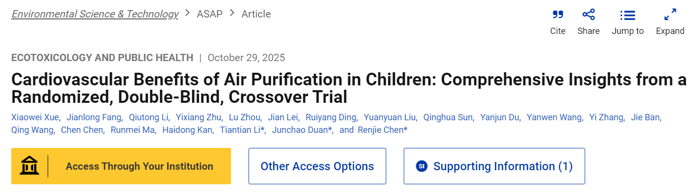 2025年10月29日,复旦大学公共卫生学院陈仁杰团队联合中国疾病预防控制中心环境与健康相关产品安全所李湉湉、首都医科大学公共卫生学院段军超,在环境科学领域权威期刊《环境科学与技术》(Environmental Science & Technology)上在线发表了题为“Cardiovascular Benefits of Air Purification in Children: Comprehensive Insights from a Randomized, Double-Blind, Crossover Trial”的研究论文。该研究通过一项随机双盲交叉对照试验,首次证实了涵盖“学校+家庭”的全天候室内空气净化干预能显著改善儿童心血管健康,并利用蛋白质组学技术探索了潜在机制。