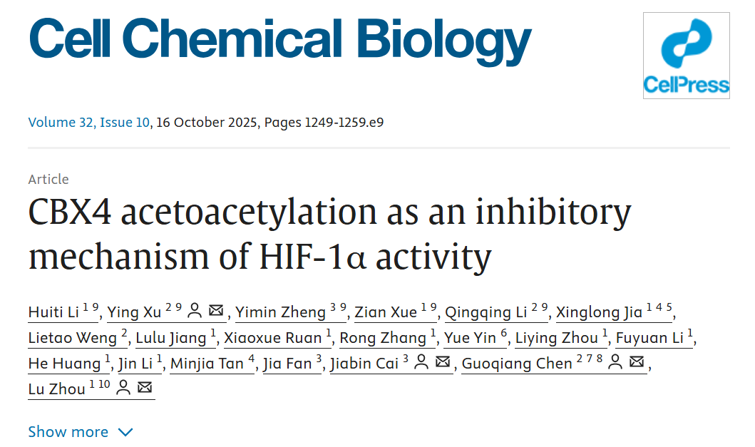 2025年10月16日,复旦大学药学院周璐教授课题组联合陈国强院士及附属中山医院樊嘉、蔡加彬团队在《细胞—化学生物学》(Cell Chemical Biology)发表了题为“CBX4 acetoacetylation as an inhibitory mechanism of HIF-1α activity”的研究论文,发现了一种调控HIF-1α转录活性的新机制。研究揭示了癌症代谢与肿瘤微环境之间的一个潜在新联系,并为抗肿瘤药物的开发提供了新的研究方向。