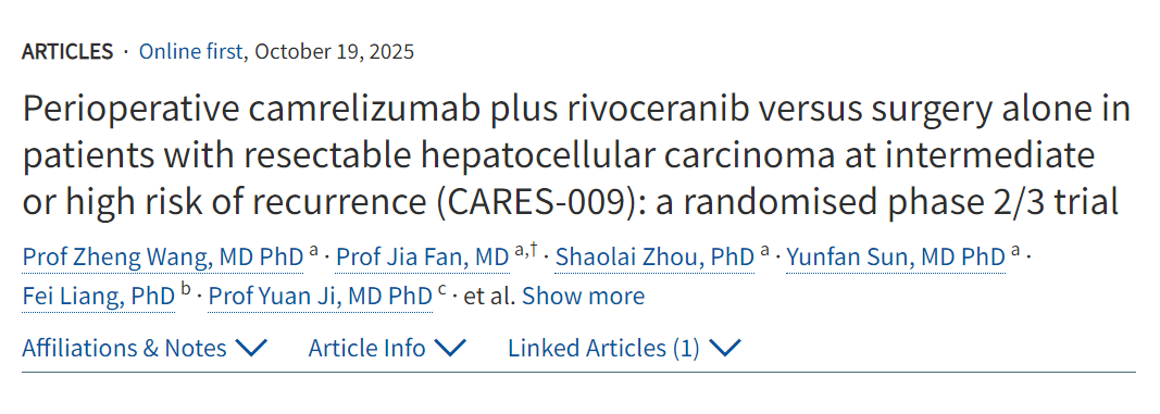 2025年10月19日,复旦大学附属中山医院樊嘉、周俭团队在《柳叶刀》(The Lancet)发表了题为“卡瑞利珠单抗联合阿帕替尼用于可切除肝细胞癌伴中高危复发风险患者的围手术期治疗:一项多中心、开放、随机对照2/3期研究(CARES-009)(Perioperative camrelizumab plus rivoceranib versus surgery alone in patients with resectable hepatocellular carcinoma at intermediate or high risk of recurrence (CARES-009): a randomised phase 2/3 trial)”的临床研究成果,首次填补了肝癌患者围手术期新辅助治疗方案的空白。研究表明,与单纯手术相比,围手术期卡瑞利珠单抗联合阿帕替尼显著改善了可切除的中高复发风险肝细胞癌患者的无事件发生生存期。