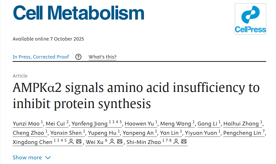 2025年10月7日,复旦大学附属妇产科医院赵世民、徐薇联合复旦大学人类表型组研究院陈兴栋团队在国际代谢领域期刊《细胞-代谢》(Cell Metabolism)发表了题为“AMPKα2 Signals Amino Acid Insufficiency to Inhibit Protein Synthesis”的研究成果。该研究首次揭示,AMPKα2能够作为大脑“氨基酸丰度的感应器”,抑制蛋白质过度合成。这一发现表明,大脑中氨基酸与蛋白质代谢的失衡是导致病理蛋白聚集的重要诱因,促进神经退行性病变。未来,靶向AMPKα2有望成为阿尔茨海默症(Alzheimer’s Disease, AD)防治的新策略。