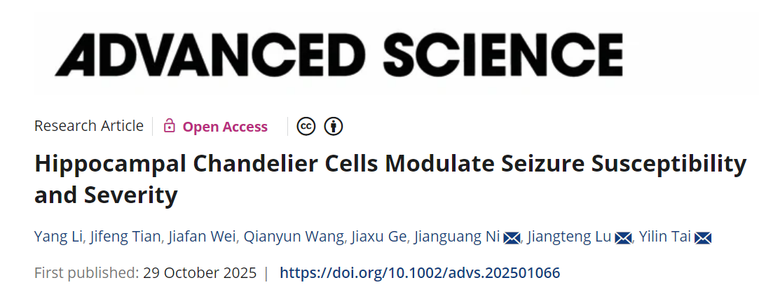 2025年10月29日,复旦大学脑科学研究院邰一琳、倪剑光课题组在《先进科学》(Advanced Science)在线发表题为“海马吊灯样细胞调控癫痫发作易感性与严重度(Hippocampal Chandelier Cells Modulate Seizure Susceptibility and Severity)”的研究论文。该研究综合利用新型遗传学工具、在体钙信号记录、化学遗传学干预及形态学分析等手段,发现海马CA1区ChCs在癫痫发作时对网络过度激活做出了响应,抑制ChCs活动会增加癫痫易感性并加剧癫痫发作,而激活其活动则能缓解症状,系统地阐明了海马CA1区ChCs在癫痫发作中起到的内源性保护作用。