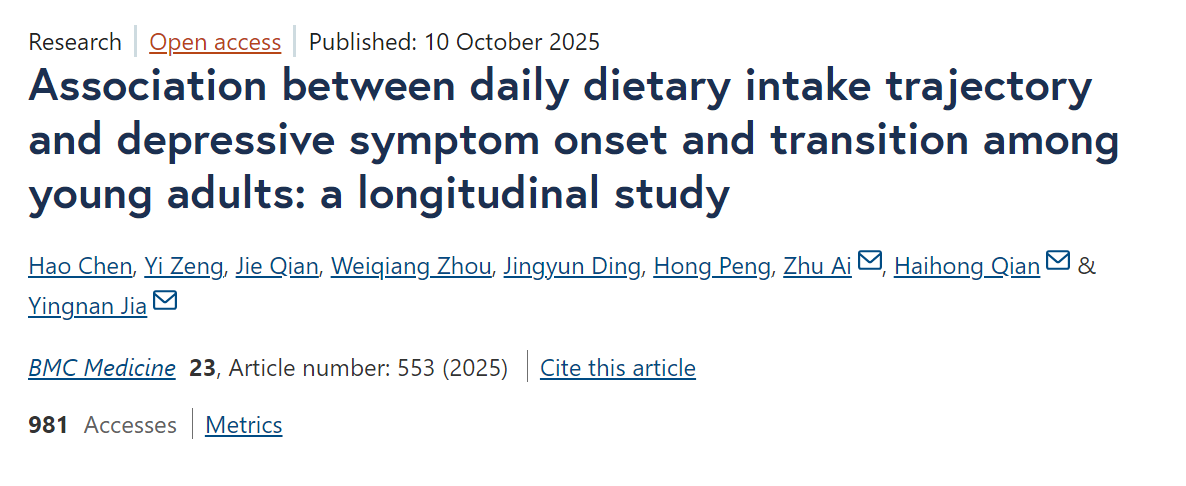 2025年10月10日,复旦大学公共卫生学院贾英男、陈浩课题组在《BMC-医学》(BMC Medicine)上发表了题为“Association between Daily Dietary Intake Trajectory and Depressive Symptom Onset and Transition among Young Adults: A Longitudinal Study”的研究论文,在膳食摄入数字监测与心理健康领域取得重要进展。该团队利用校园智能点餐系统大数据,首次描绘了青年群体长期膳食摄入轨迹与抑郁症状发生及转变的关联图谱。