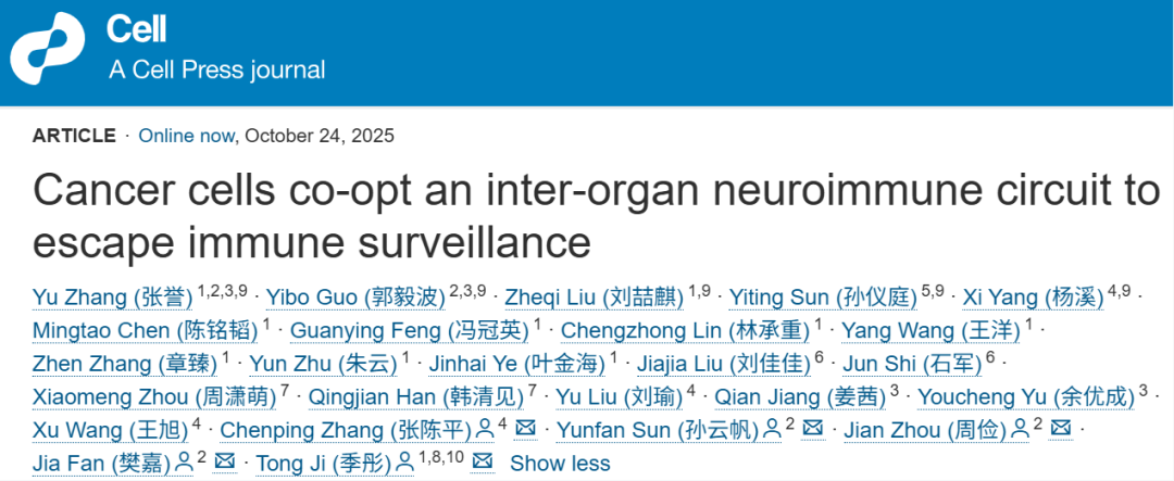 2025年10月24日,复旦大学附属中山医院樊嘉、季彤、周俭、孙云帆及上海交通大学医学院附属第九人民医院张陈平合作在《细胞》(Cell)上发表了题为“Cancer cells co-opt an inter-organ neuroimmune circuit to escape immune surveillance(肿瘤细胞利用跨器官神经免疫轴逃避免疫监视)”的研究论文。研究首次揭示了免疫压力下的肿瘤细胞,可“劫持”感觉神经远程抑制引流淋巴结(TDLN)中的系统性抗肿瘤免疫应答,从而实现免疫逃逸。阻断这种神经介导的肿瘤-TDLN通讯不仅显著增强免疫治疗疗效,也能显著抑制癌痛。