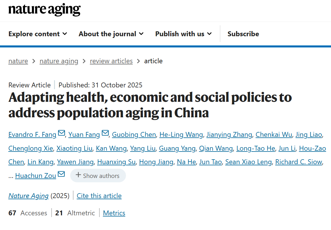 2025年10月31日,复旦大学公共卫生学院邹华春联合挪威奥斯陆大学方飞、方圆、瑞典哥德堡大学吴晶等30余位来自不同国家和地区的专家共同在《自然-衰老》(Nature Aging)发表了题为“Adapting health, economic and social policies to address population aging in China”的综述文章,综述了我国在人口老龄化领域的相关进展、挑战及潜在应对方案,总结了中国当前在促进普通人群健康长寿方面的各项政策,重点关注社会医疗保险、长期护理保险(LTCI)、社区与居家养老、姑息治疗、老年医学研究、公共卫生预防以及营养与医疗干预等领域,并分析了其中的优势与不足。