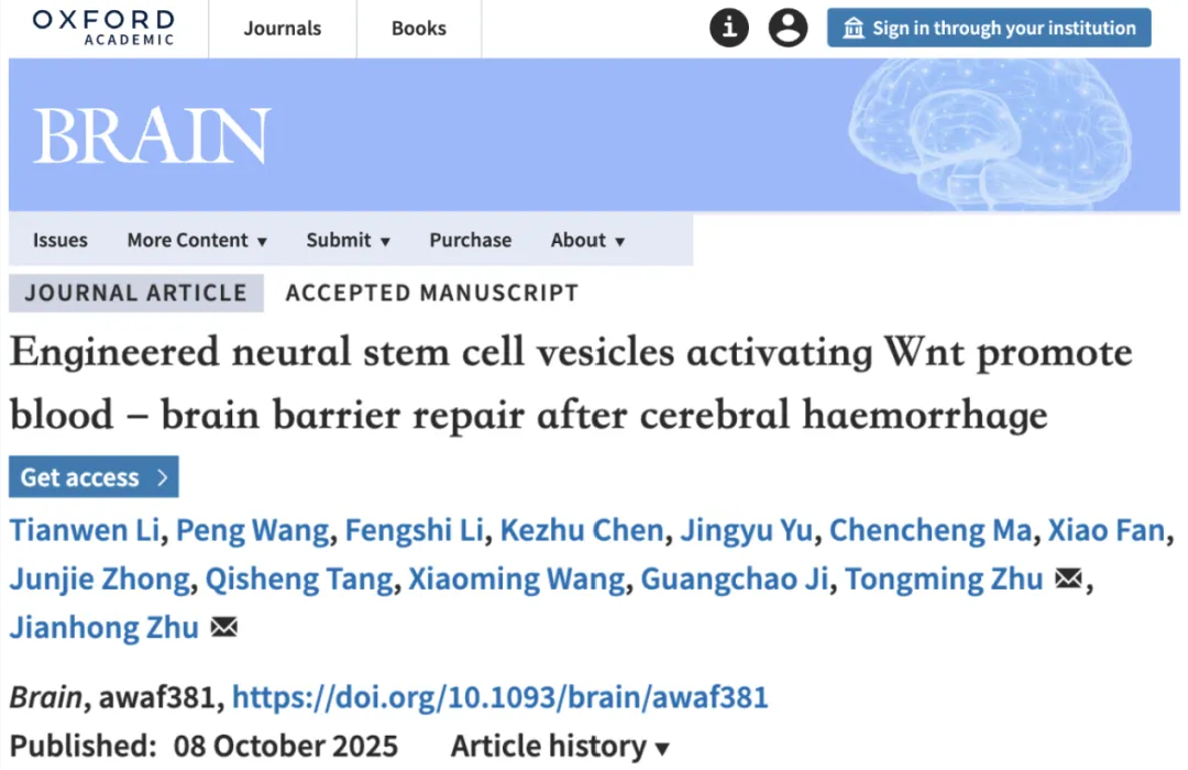 2025年10月8日,复旦大学附属华山医院神经外科朱剑虹团队在《脑:神经病学杂志》(Brain) 在线发表了题为“工程化神经干细胞囊泡通过激活Wnt促进脑出血后血脑屏障修复(Engineered neural stem cell vesicles activating Wnt promote blood - brain barrier repair after cerebral haemorrhage)”的论文,展示了在神经修复治疗领域的研究成果。该研究基于团队在神经干细胞领域近二十年积累,利用自主研制的神经干细胞来源的细胞外囊泡作为载体,研发出能够精准靶向并修复血脑屏障的模块化“智能囊泡”(EVs-WK),是团队推动神经干细胞基础研究向临床治疗转化的又一突破。