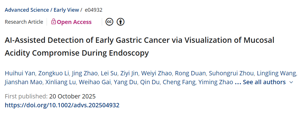 2025年10月20日,复旦大学药学院李聪、游艳,浙江大学医学院附属第二医院蔡建庭联合研究团队,在《先进科学》(Advanced Science)发表了题为 “AI-Assisted Detection of Early Gastric Cancer via Visualization of Mucosal Acidity Compromise During Endoscopy”的研究论文。团队构建了 “pH 比率响应拉曼阵列”,并结合 AI光谱处理技术打造了术中检测系统,该系统通过将胃黏膜 pH分布与形态学特征相结合,能准确区分 “癌与非癌”组织,快速锁定病灶,既避免因形态相似导致的假阳性,为内窥镜黏膜下剥离术(ESD)手术提供精准导航。