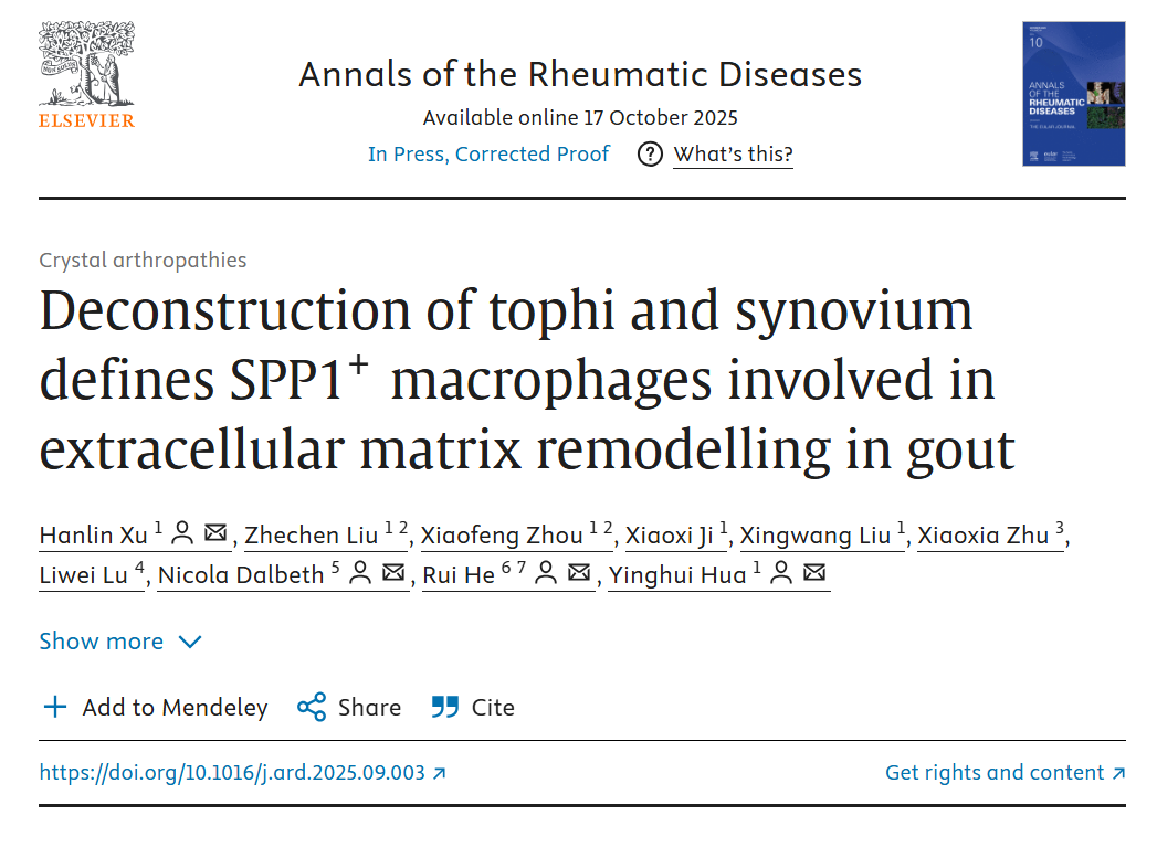 2025年10月17日,复旦大学附属华山医院运动医学科华英汇团队在《风湿病学年鉴》(Annals of the Rheumatic Diseases)以“解析痛风石与滑膜组织:SPP1阳性巨噬细胞驱动关节组织细胞外基质重塑(Deconstruction of tophi and synovium defines SPP1⁺ macrophages involved in extracellular matrix remodeling in gout)”为题发表论文,展示关节疾病研究领域取得的进展,该研究首次系统解析了痛风石(tophi)及痛风间期滑膜组织的单细胞及空间转录组特征,揭示了SPP1高表达巨噬细胞在细胞外基质(ECM)重塑中的关键作用,为理解痛风慢性病变机制提供了全新视角。