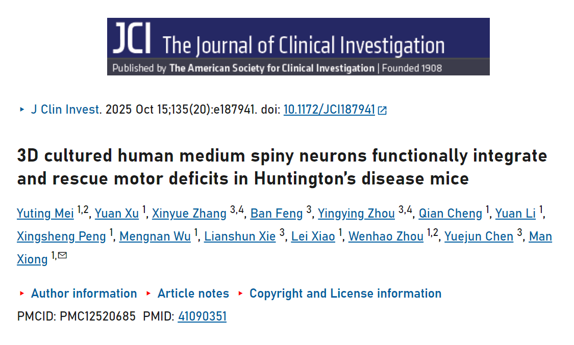 2025年10月15日,复旦大学脑科学研究院熊曼课题组在《临床研究杂志》(Journal of Clinical Investigation)在线发表了题为“3D培养的人源中型多棘神经元能够功能性整合进亨廷顿病小鼠的神经环路并改善其运动缺陷(3D-cultured human medium spiny neurons functionally integrate and rescue motor deficits in Huntington’s disease mice)”的研究论文。研究首次建立了人多能干细胞高效定向分化为纹状体中型多棘神经元(MSN)亚型的三维悬浮培养新技术,分化的细胞在分子特征上与胎脑内源神经元高度相似;移植实验进一步证实,这些来源于人多能干细胞的MSN亚型能够在结构与功能层面整合入亨廷顿病(Huntington’s Disease, HD)模型小鼠的基底神经节环路的直接通路和间接通路,显著改善HD小鼠的运动功能障碍,为基于神经环路重建的HD的细胞替代治疗提供了全新技术途径和理论基础。