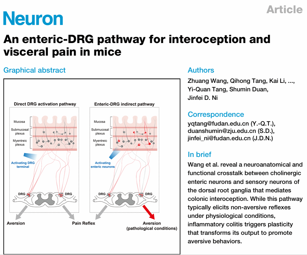 2025年10月24日,复旦大学脑科学转化研究院倪金飞课题组在《神经元》(Neuron)上发表了题为“ An enteric—DRG pathway for interoception and visceral pain in mice ”的研究论文。研究发现小鼠肠道-背根神经节(DRG)传入神经在远端结肠与肠神经元广泛关联,分布于胃肠道等多器官且终端形态特殊;光遗传学激活显示,结肠支配DRG不同亚型引发不同伤害性行为反应,胆碱能肠神经元经DRG-脊髓通路触发非厌恶反射(乙酰胆碱为关键信号);炎症会使该通路从非厌恶转为厌恶,且炎症恢复期仍持续,此发现拓展了DRG介导内脏感觉的认知,为内脏疼痛研究提供方向。
