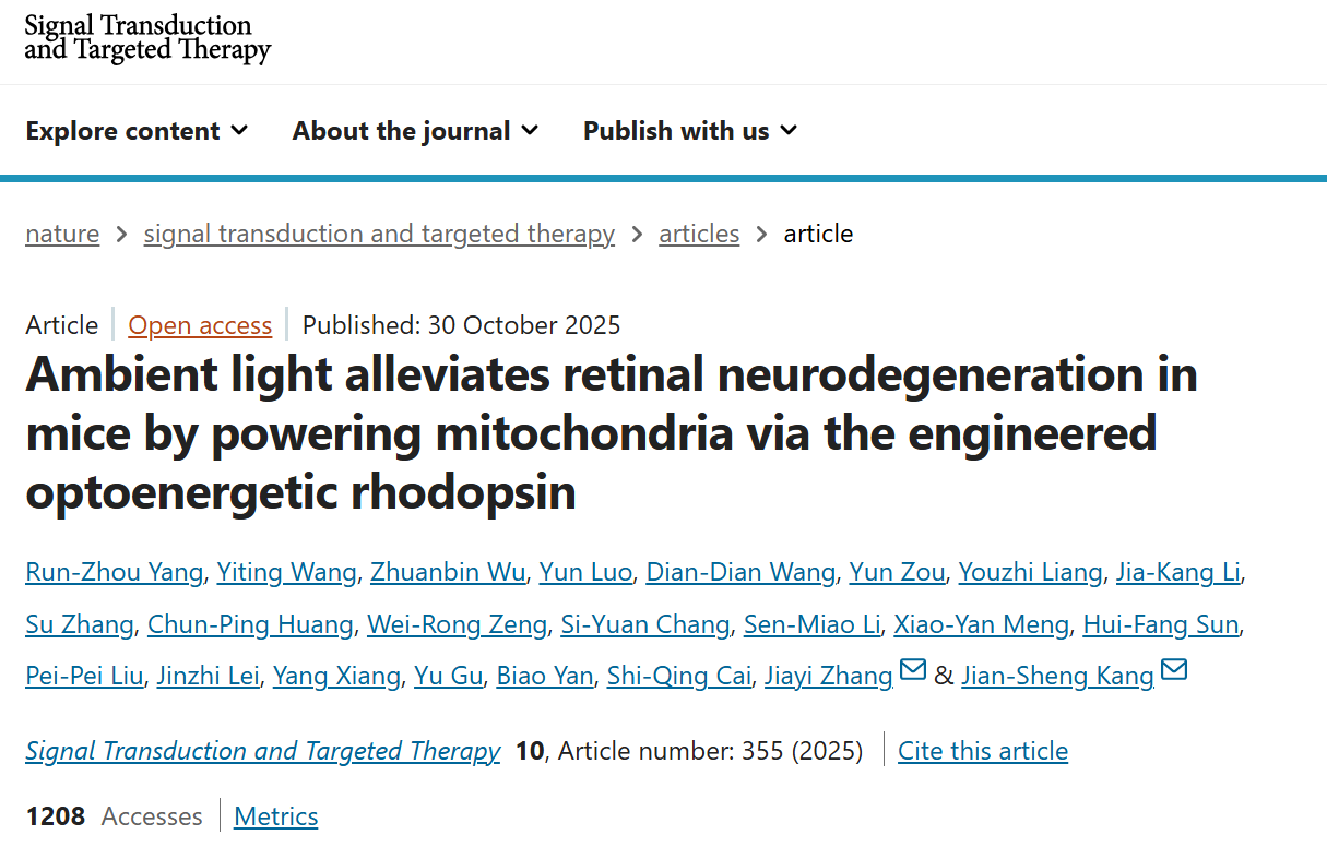 2025年10月31日,复旦大学脑科学研究院/脑功能与脑疾病全国重点实验室张嘉漪、颜彪团队联合郑州大学第一附属医院康建胜团队,在《信号转导与靶向治疗》(Signal Transduction and Targeted Therapy)上发表了题为“利用工程化光遗传蛋白驱动线粒体以缓解视网膜神经变性(Ambient light alleviates retinal neurodegeneration in mice by powering mitochondria via the engineered optoenergetic rhodopsin)”的论文,开发了一种新型的定位于线粒体内膜的光动力蛋白mt-EcGAPR,环境光进入青光眼实验模型小鼠眼球后,激活该蛋白并促进线粒体功能,从而缓解视网膜神经节细胞的丧失和视功能的损伤。