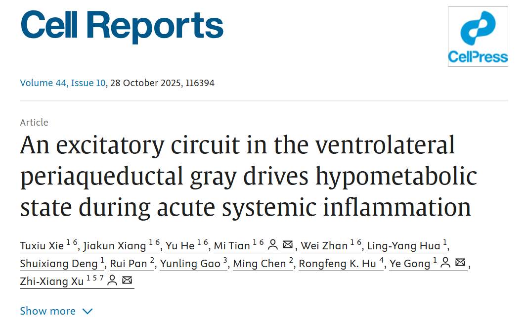 2025年10月28日,复旦大学脑科学研究院/脑功能与脑疾病全国重点实验室许智祥课题组联合附属华山医院重症医学科宫晔团队,在《细胞报告》(Cell Reports)发表了题为“中脑导水管腹外侧区的兴奋性神经环路驱动急性系统性炎症诱导的低代谢状态(An excitatory circuit in the ventrolateral periaqueductal gray drives hypometabolic state during acute systemic inflammation)”的研究论文,发现位于中脑导水管腹外侧区(vlPAG)至延髓孤束核(NTS)的一条兴奋性环路在系统性炎症诱导低代谢状态中发挥关键作用。