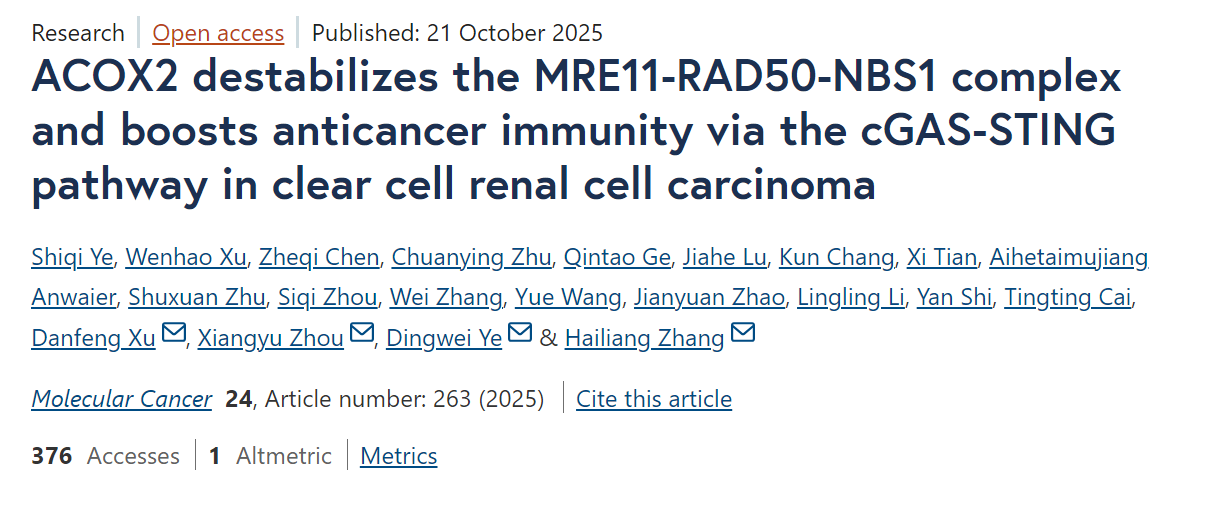 2025年10月21日,复旦大学附属华东医院泌尿外科张海梁团队近日在《分子癌症》(Molecular Cancer)上发表题为“ACOX2 destabilizes the MRE11-RAD50-NBS1 complex and boosts anticancer immunity via the cGAS-STING pathway in clear cell renal cell carcinoma”的论文。该研究首次揭示了ACOX2在ccRCC中的抑癌作用及非代谢调控机制,为晚期ccRCC患者接受PARPi、ICI及两者联合治疗提供了有潜力的生物标志物。