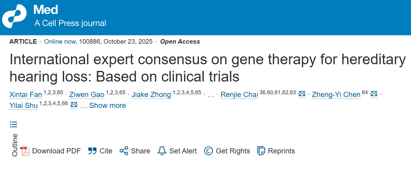 2025年10月23日,由复旦大学附属眼耳鼻喉科医院领衔的全球首个遗传性耳聋基因治疗国际专家共识在期刊《医学》(Med)上正式发布。该共识由该院舒易来团队牵头,联合哈佛大学医学院Zheng-Yi Chen、东南大学柴人杰和美国哥伦比亚大学医学中心Lawrence R. Lustig等,召集全球包括中国、美国、西班牙、英国、韩国和德国等国家的46位耳科学、遗传学、听力学、基因治疗及听觉康复等多学科领域专家,历时1年余共同制定。该共识严格采用改良版德尔菲法,最终形成30条共识声明,内容涵盖伦理审查(1条声明)、患者筛选(12条声明)、术前诊断和评估(9条声明)、基因治疗药物递送(4条声明)、术后随访(3条声明)及听觉言语康复(1条声明)六大关键模块,为全球范围内遗传性耳聋基因治疗的临床应用提供了首个标准化框架。