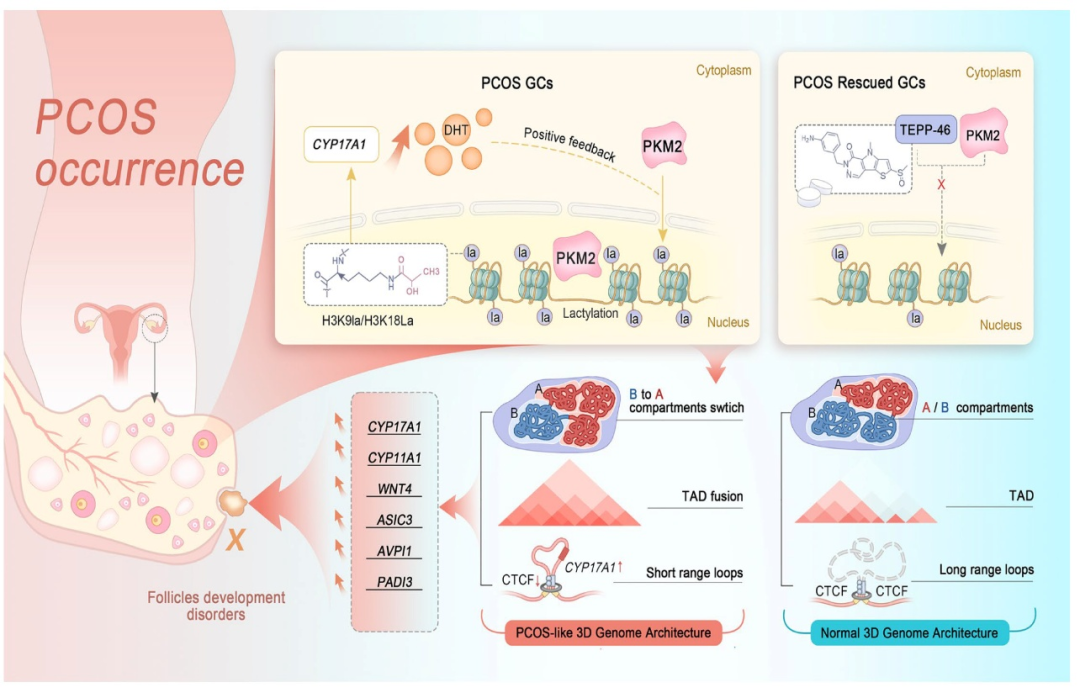多囊卵巢综合征(PCOS)是育龄期女性高发的一种内分泌及代谢紊乱疾病,其典型表征为高雄激素血症、稀发排卵及卵巢多囊样改变,常常伴随胰岛素抵抗、肥胖和2型糖尿病等。由于该病病因复杂且异质性强,其具体的发病机制仍不清楚。2025年11月19日,复旦大学附属妇产科医院黄荷凤院士团队在Signal Transduction and Targeted Therapy上在线发表了题为“PKM2-mediated Histone Lactylation Alters Three-dimensional Genomic Architecture in Polycystic Ovary Syndrome”的研究成果。该研究首次指出,在PCOS中,代谢关键分子丙酮酸激酶PKM2作为细胞核内重要的调节因子,诱发乳酸堆积于细胞核内,促进组蛋白乳酸化修饰,进而驱动染色质三维基因组结构全局性改变,导致多囊卵巢综合征(PCOS)的发生。