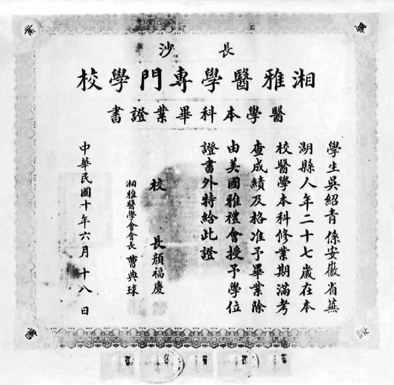 吴绍青的湘雅医学专门学校毕业证书